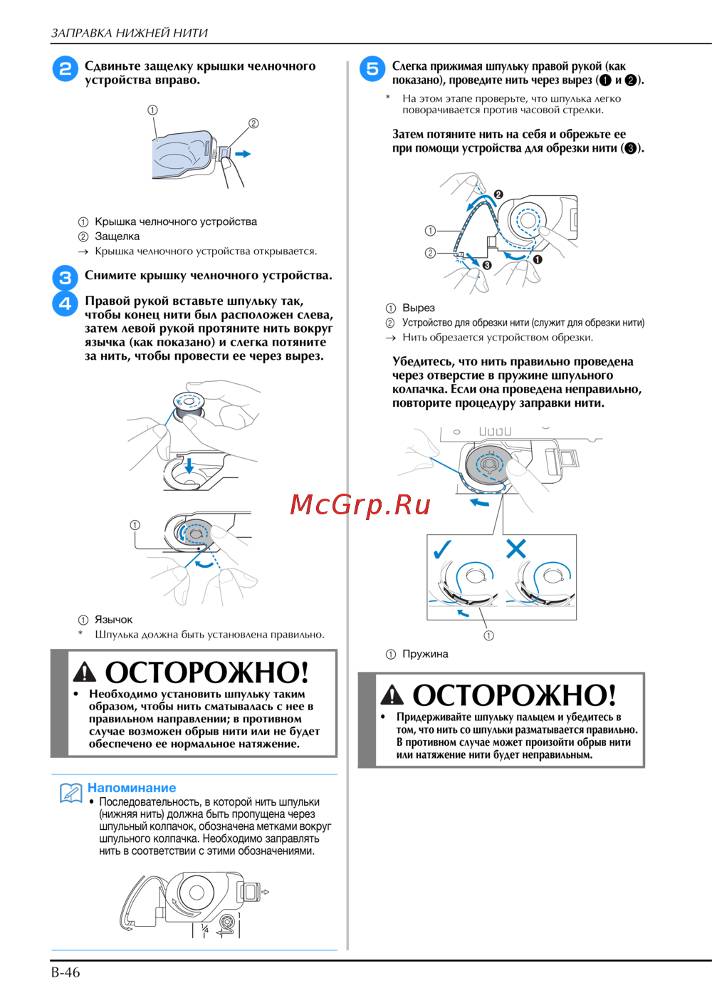 - Вытащите запутавшуюся нить если она не вытаскивается обрежьте нить ножницами p.310