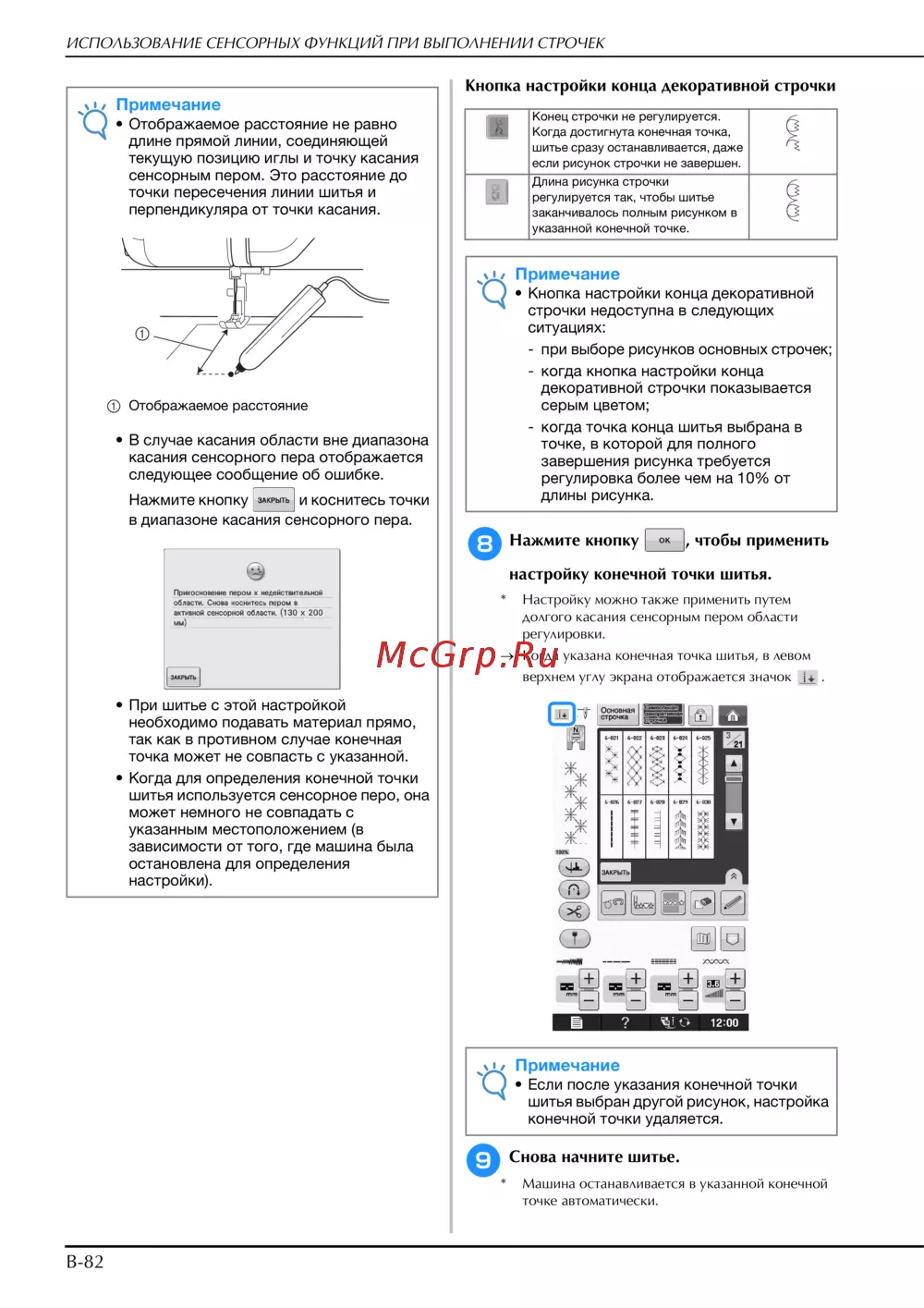 - Если нажать кнопку старт стоп или кнопку обратные стежки на неправильно настроенной машине или же если операция выполняется неправильно машина не начинает шить при этом звучит аварийный сигнал и на жк дисплее отображается сообщение об ошибке если появляется сообщение об ошибке следуйте инструкциям представленным в этом сообщении ниже приводятся пояснения к сообщениям об ошибках пользуйтесь этими пояснениями по мере p.320