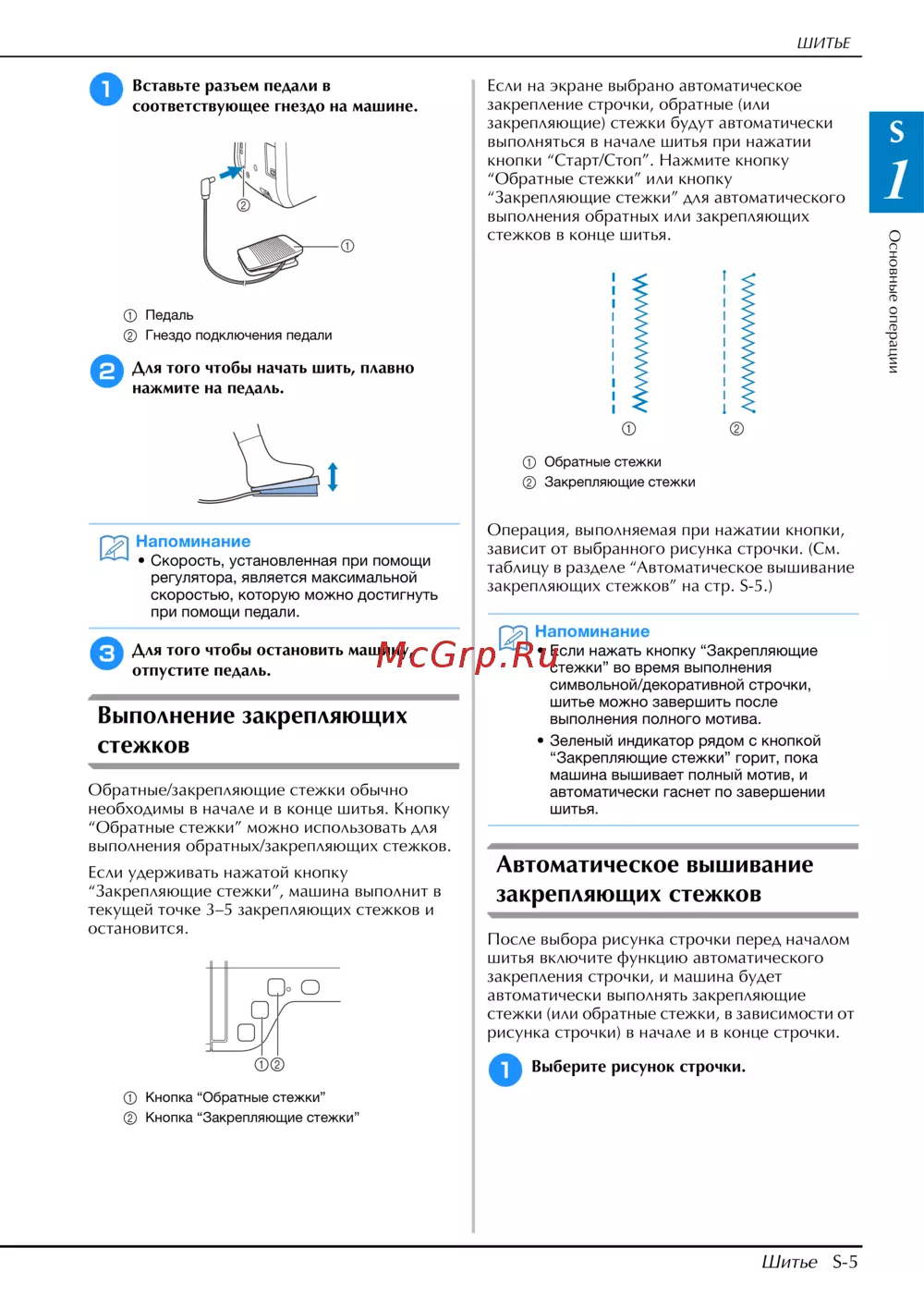 Узнайте основные операции шитья, включая использование педали, выполнение закрепляющих стежков и автоматическое вышивание. Полезные советы для начинающих.