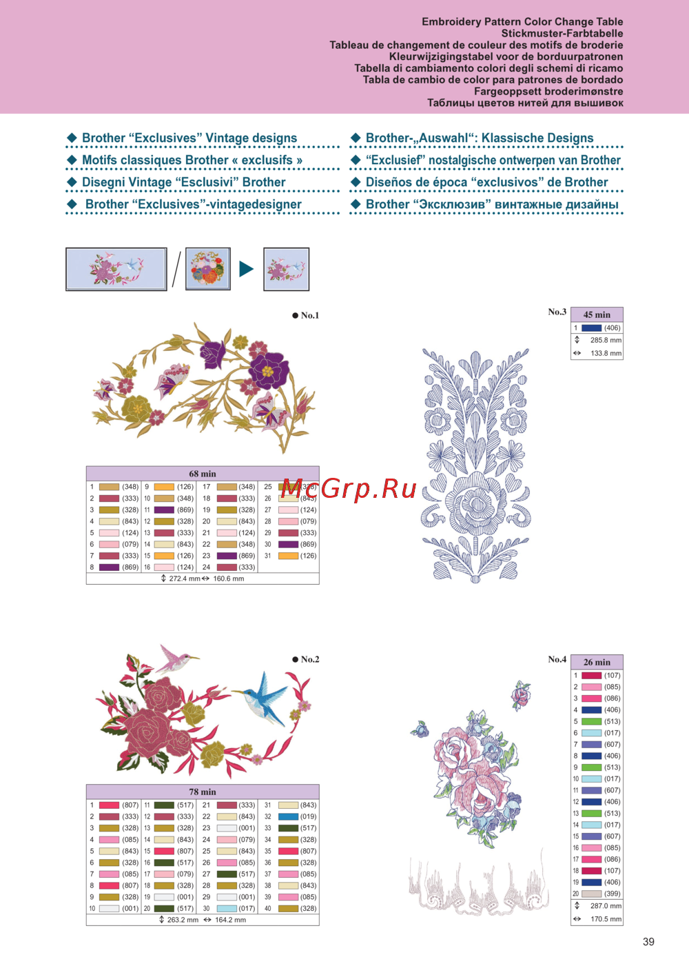- Embroidery pattern color change table stickmuster farbtabelle tableau de changement de couleur des motifs de broderie kleurwijzigingstabel voor de borduurpatronen tabella di cambiamento colori degli schemi di ricamo tabla de cambio de color para patrones de bordado fargeoppsett broderimønstre таблицы цветов нитей для вышивок p.47