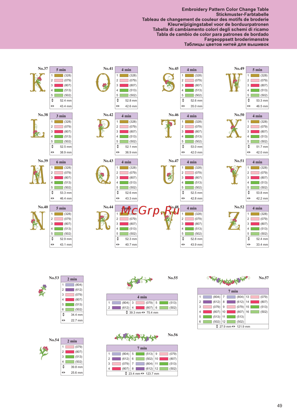 - Embroidery pattern color change table stickmuster farbtabelle tableau de changement de couleur des motifs de broderie kleurwijzigingstabel voor de borduurpatronen tabella di cambiamento colori degli schemi di ricamo tabla de cambio de color para patrones de bordado fargeoppsett broderimønstre таблицы цветов нитей для вышивок p.49