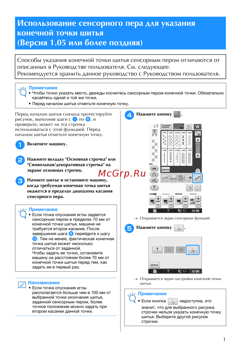 - Способы указания конечной точки шитья сенсорным пером отличаются от описанных в руководстве пользователя см следующее рекомендуется хранить данное руководство с руководством пользователя p.1