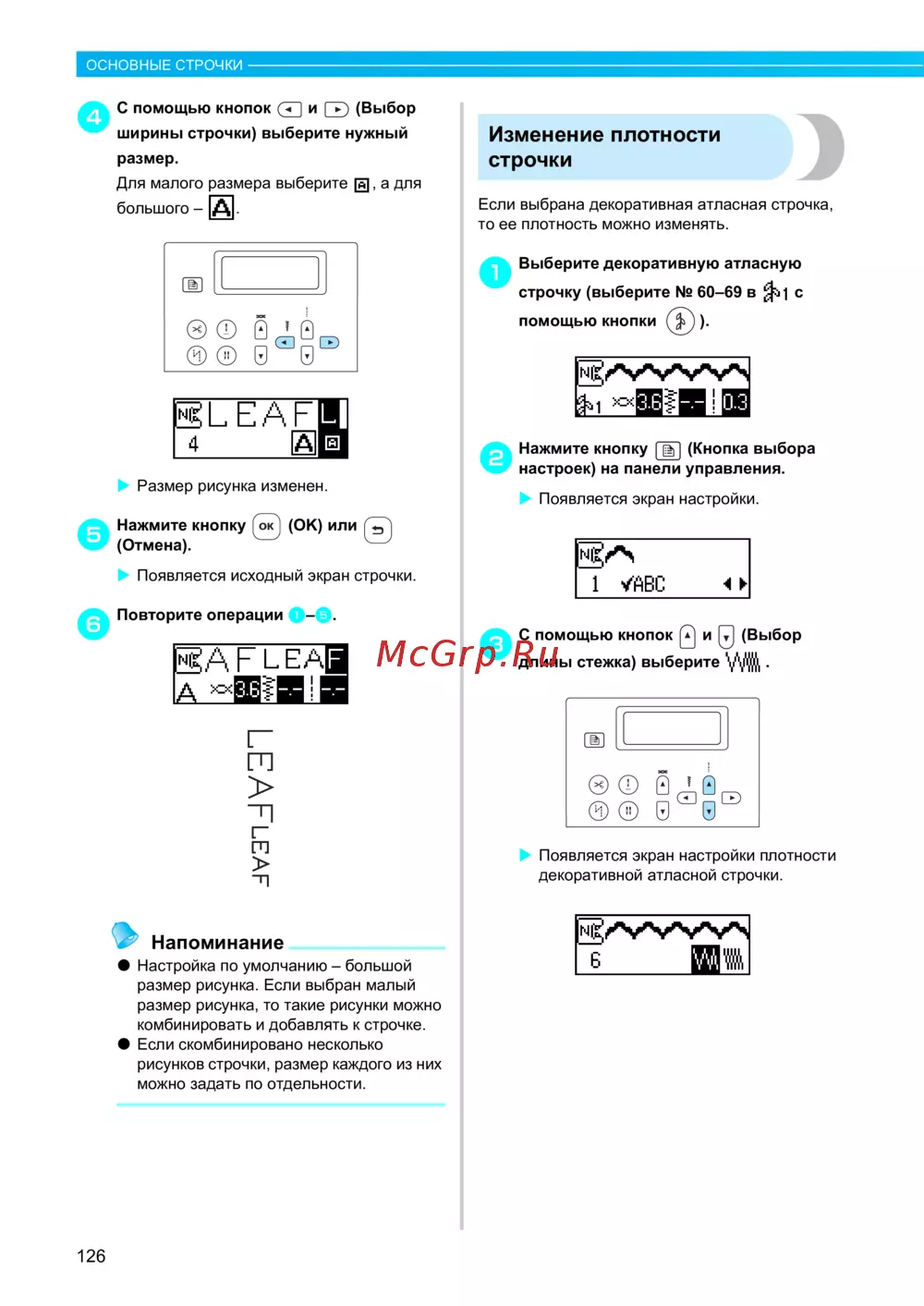 - Если плотность строчки слишком высока то в зависимости от типа иглы стежки могут начать наезжать друг на друга что может привести к поломке иглы p.129
