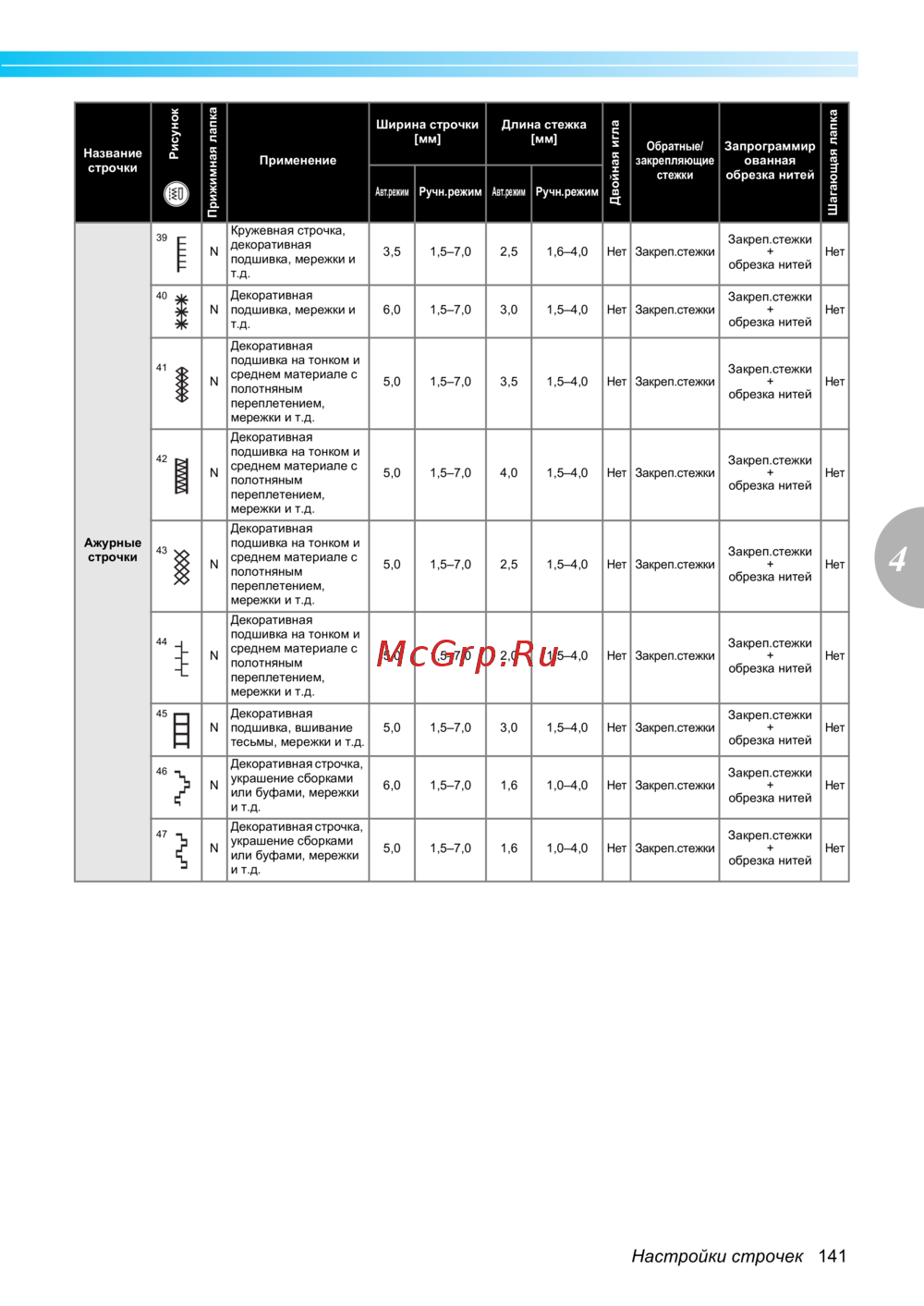- В следующей таблице для основных строчек приводятся варианты применения длина стежка и ширина строчки а также возможность использования двойной иглы p.140