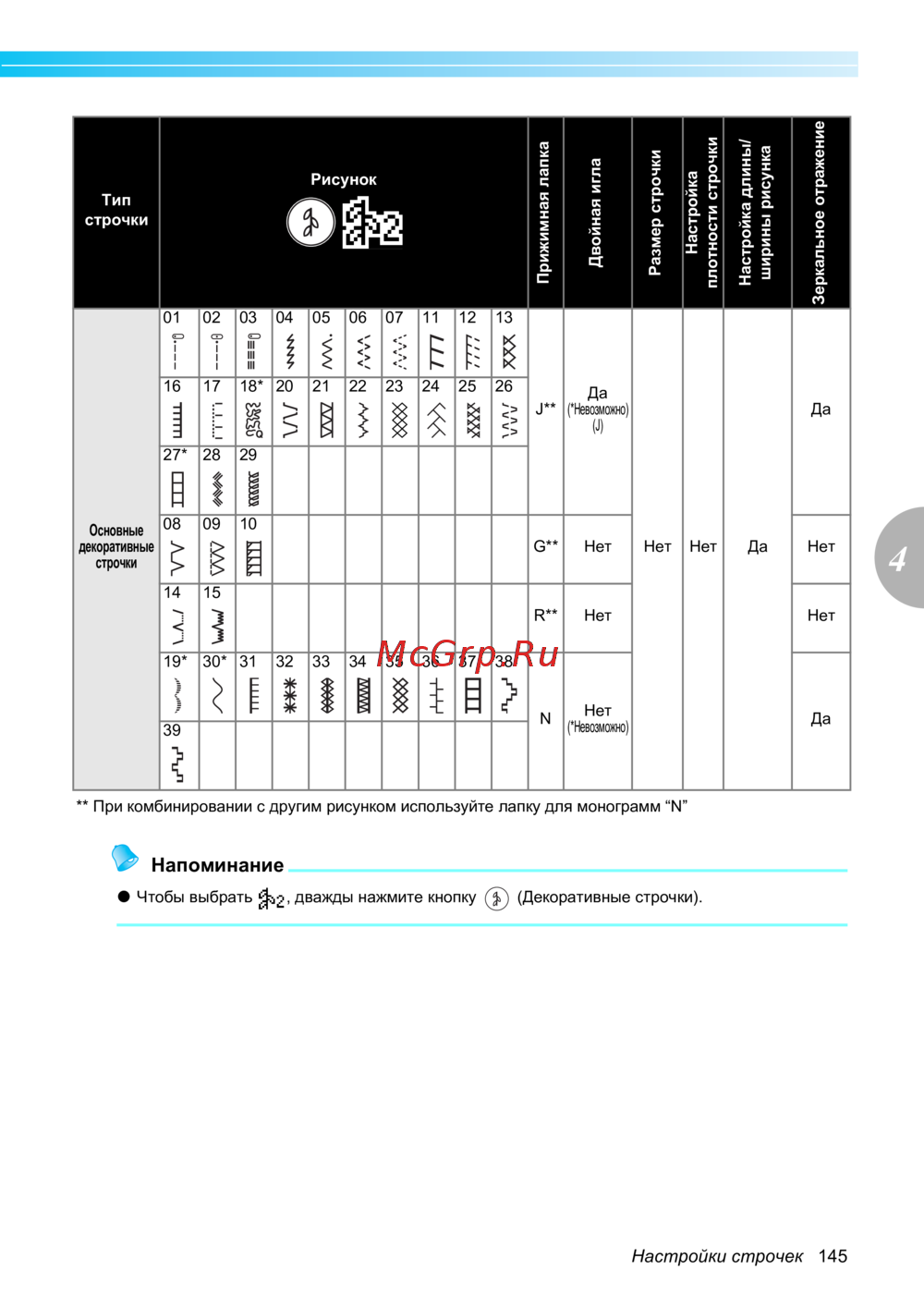 - В следующей таблице для основных строчек приводятся варианты применения длина стежка и ширина строчки а также возможность использования двойной иглы p.140