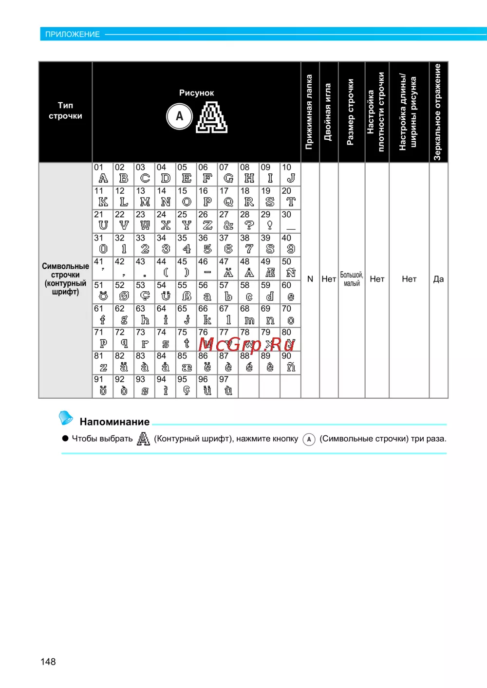 z Чтобы выбрать (Контурный шрифт), нажмите кнопку (Символьные строчки) три раза.