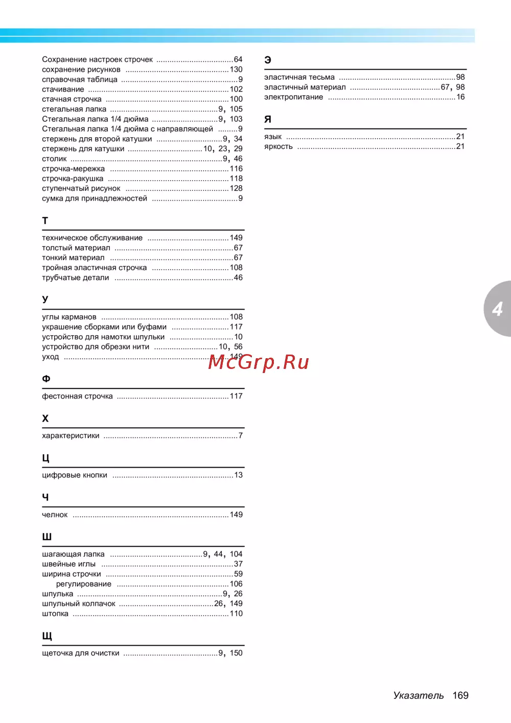 Изучите полный указатель швейных техник, аксессуаров и материалов. Найдите информацию о строчках, лапках и уходе за швейными изделиями.