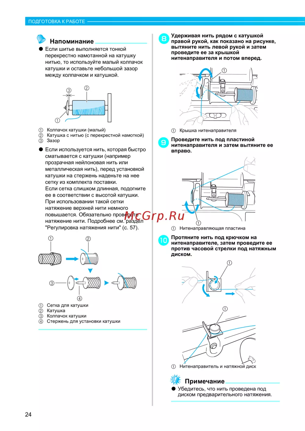 - Если нить запуталась под седлом устройства намотки шпульки p.160