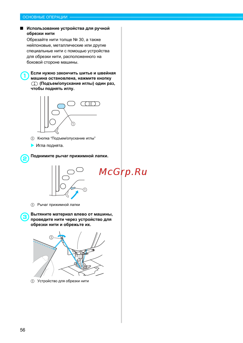 - Не нажимайте кнопку обрезка нити если под лапкой нет материала или во время шитья это может привести к повреждению машины обрезайте нити толще 30 а также нейлоновые нити или другие специальные нити с помощью устройства для обрезки расположенного на боковой стороне машины подробнее см раздел обрезка нитей с 55 p.14