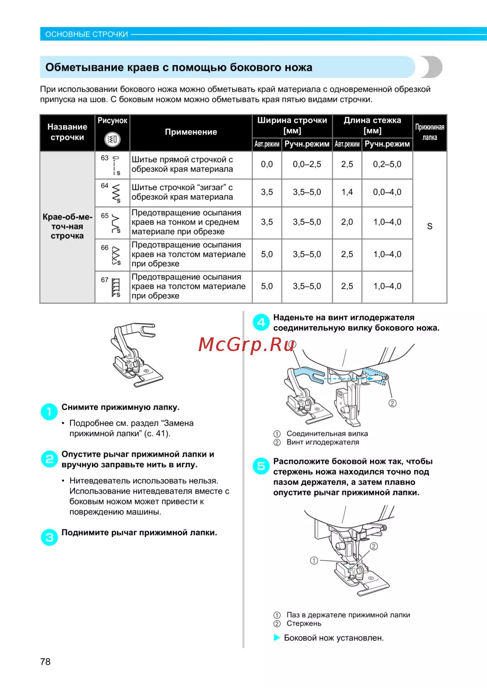 припуска на шов. С боковым ножом можно обметывать края пятью видами строчки.