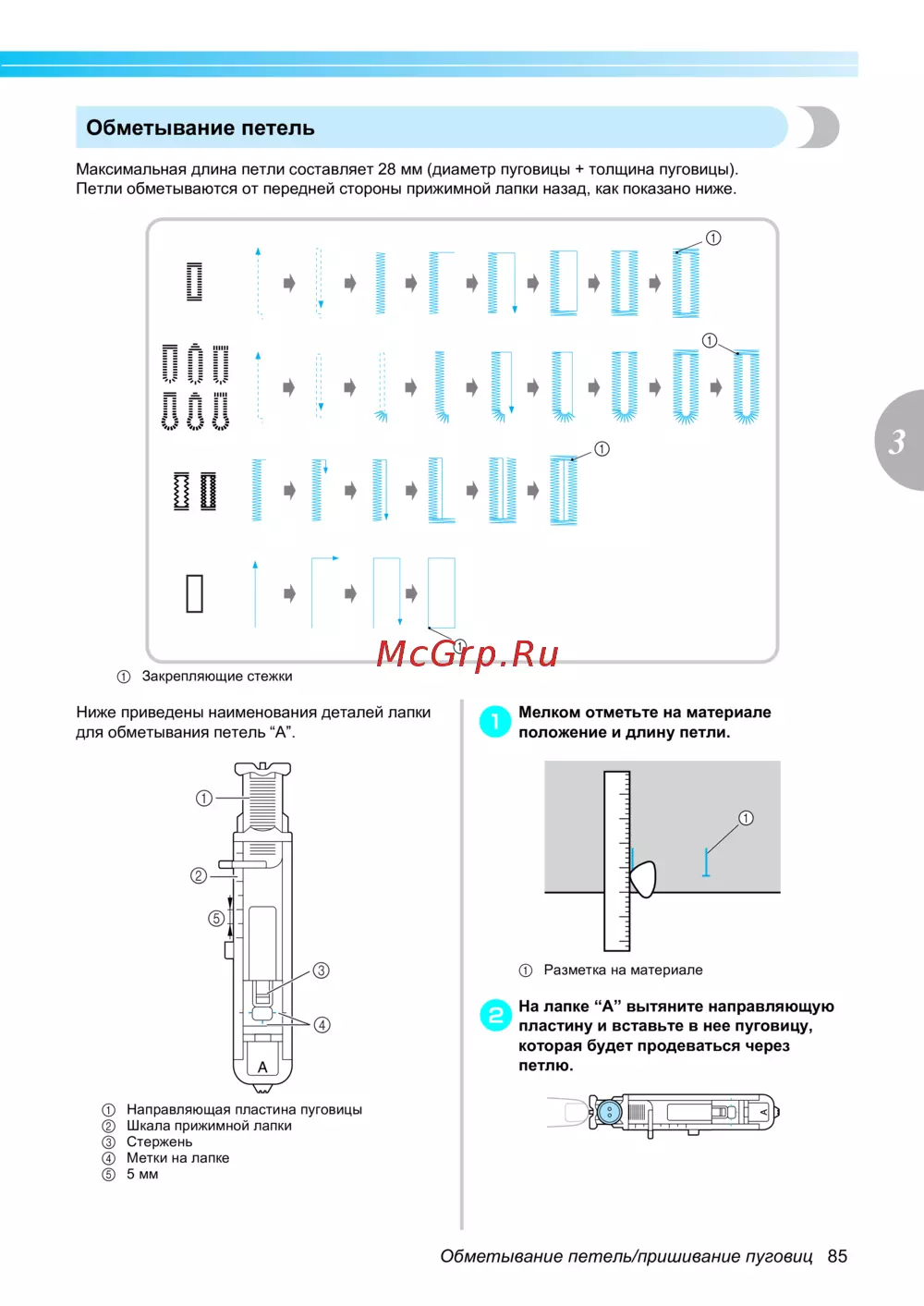Петли обметываются от передней стороны прижимной лапки назад, как показано ниже.