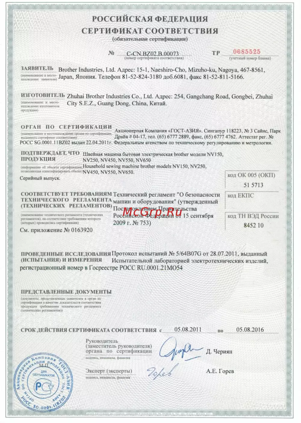 РОССИЙСКАЯ ФЕДЕРАЦИЯ СЕРТИФИКАТ СООТВЕТСТВИЯ обязательная сертификация Тр C CN BZ02 B 0007T 0685525 помер сертификата соответствия учетный номер бланка ГАЯ ВИ I Е 1Ь Brother Industries Ltd Адрес 15 1 Naeshiro Cho Mizuho ku Nagoya 467 8561 Japan Япония Телефон 81 52 824 3180 доб 6081 факс 81 52 811 5166 п 5ГО1 ОБИТЕЛЬ Zhuhai Brother Industries Со Ltd Адрес 254 Gangchang Road Gongbei Zhuhai City China НПХОАлснш ниотопитс м S E Z Guang Dong 1 Китай продукции ОРГАН ПО СЕРТИФИКАЦИИ Акционерная компания Г ОС АЗИЯ Сингапур 118223 3 Саинс Паркмниг и мгсто1и1 0МД1 11и opram лисер фпыии1Н _ _ _ _ вылднппиисвртифпм xjiuerrow Драив 04 17 тел 65 6777 2889 факс 65 6777 4762 Аттестат per РОСС SG 0001 11BZ02 выдан 22 04 2011 г Федеральным агенством по техническому регулированию и метрологии ДА ЩЛИМГР ПОД ВЕРЖДАЕТ Ч IО Швейная машина бытовая электрическая brother модели NVI50 ПРОДУКЦИЯ NV250 NV450 NV550 NV650 инфор об o na K L гертифпкпион Household sewing machine brother models NV 150 NV250 лоиичяюпшя и 1ентН ч1Цир1Ф 1 1 о Н с 1 У450 NV550 NV650 Серийный выпуск код ОК 005 ОКП 51 5713 СООТВЕТСТВУЕТ ТРЕБОВАНИЯМ Технический регламент О безопасности ТЕХНИЧЕСКОГО РЕГЛАМЕНТА машин и оборудования утвержденный ТЕХНИЧЕСКИХ РЕГЛАМЕНТОВ наимгнонаннс гечимческого репшмеита тсхиичесюи регпамв1гл нн соотвстстанс требованиям которого которых проводилось сертификация код ЕКПС Постановлением Правительства Российской Федерации от 15 сентября 2009 г 753 код TH В ЭД России 8452 10 См приложение 0163920 ПРОВЕДЕННЫЕ ИССЛЕДОВАНИЯ Протокол испытаний 5 64В07С от 28 07 2011 выданный ИСПЫТАНИЯ И ИЗМЕРЕНИЯ Испытательной лабораторией электротехнических изделий регистрационный номер в Госреестре РОСС Ии 0001 21М054 ПРЕДСТАВЛЕННЫЕ ДОКУМЕНТЫ документы предотияленные шяянтслсы н uprwi по ссрти шкдит к качение Д0МШ1е1ьст бОсгпмпсПМа продукции требошмиим технического репшмеита Технических pctnUMCHTVn СРОК ДЕЙСТВИЯ СЕРТИФИКАТА СООТВЕТСТВИЯ с 05 08 2011 Руководитель заместитель руководителя органа по сертификации ПО 05 08 2016 Д Чериян подпись тшшшлм фамилия qа Эксперт эксперты для СЕРТИФИКАТ ПОДПИСЬ нянциаш Ьамплни S3 л А Е Горев
