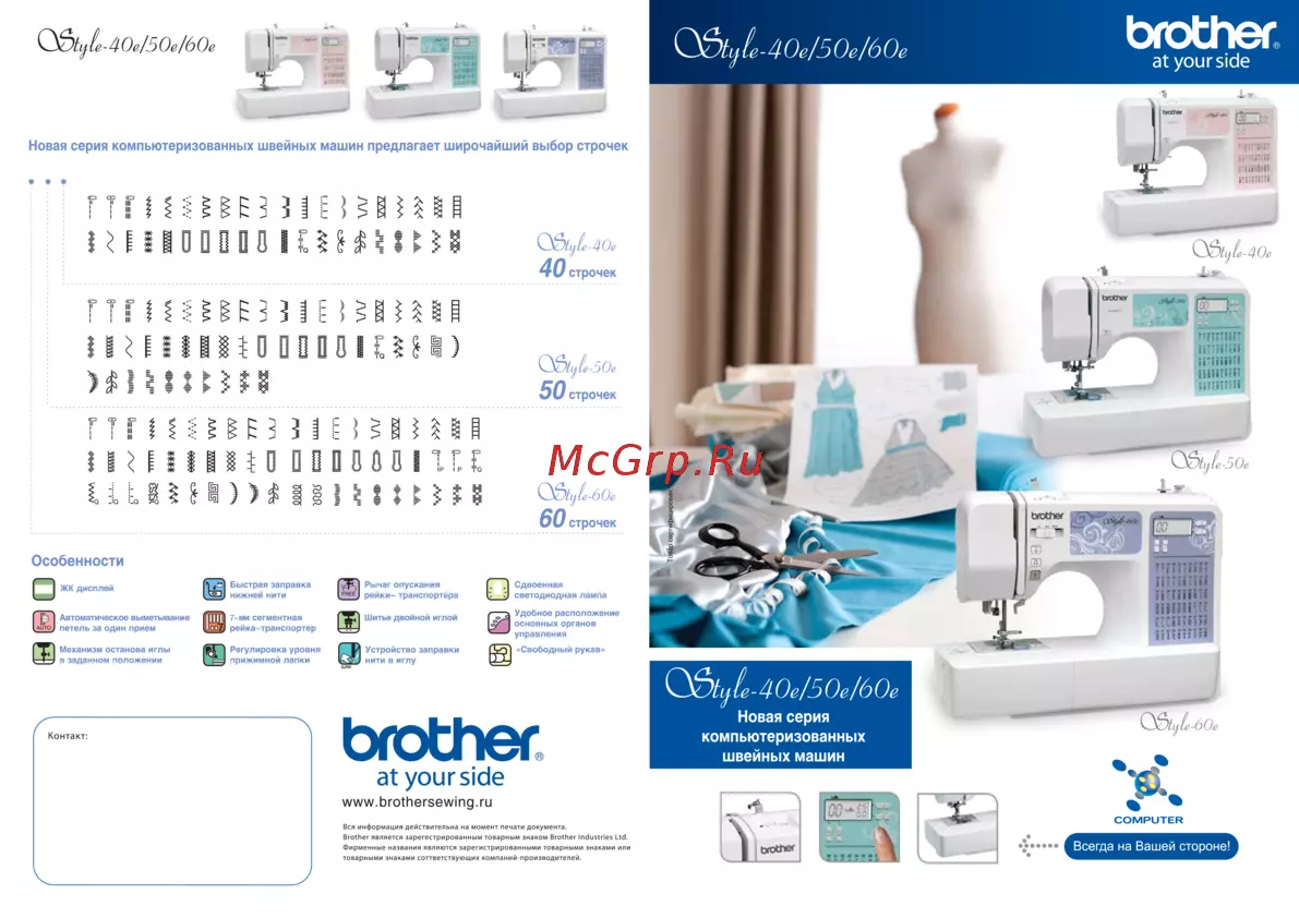 Оё й Ь 4Ое 5Ое 6Ое строчек Особенности О ЖК дисплей Автоматическое выметывание петель за один прием Механизм останова иглы в заданном положении Рычаг опускания рейки транспортера Быстрая заправка нижней нити Шитье двойной иглой ГПТ 7 ми сегментная U nnlj рейка транспортер Регулировка уровня прижимной лапки 1 Устройство заправки 4 нити в иглу 0 Товар сертифицирован Новая серия компьютеризованных швейных машин предлагает широчайший выбор строчек Сдвоенная светодиодная лампа Удобное расположение основных органов управления Свободный рукав SUPER 40е 50е 60е Новая серия компьютеризованных швейных машин at your side www brothersewing ru Вся информация действительна на момент печати документа Brother является зарегестрированным товарным знаком Brother Industries Ltd Фирменные названия являются зарегистрированными товарными знаками или товарными знаками соттветствующих компаний производителей COMPUTER Всегда на Вашей стороне