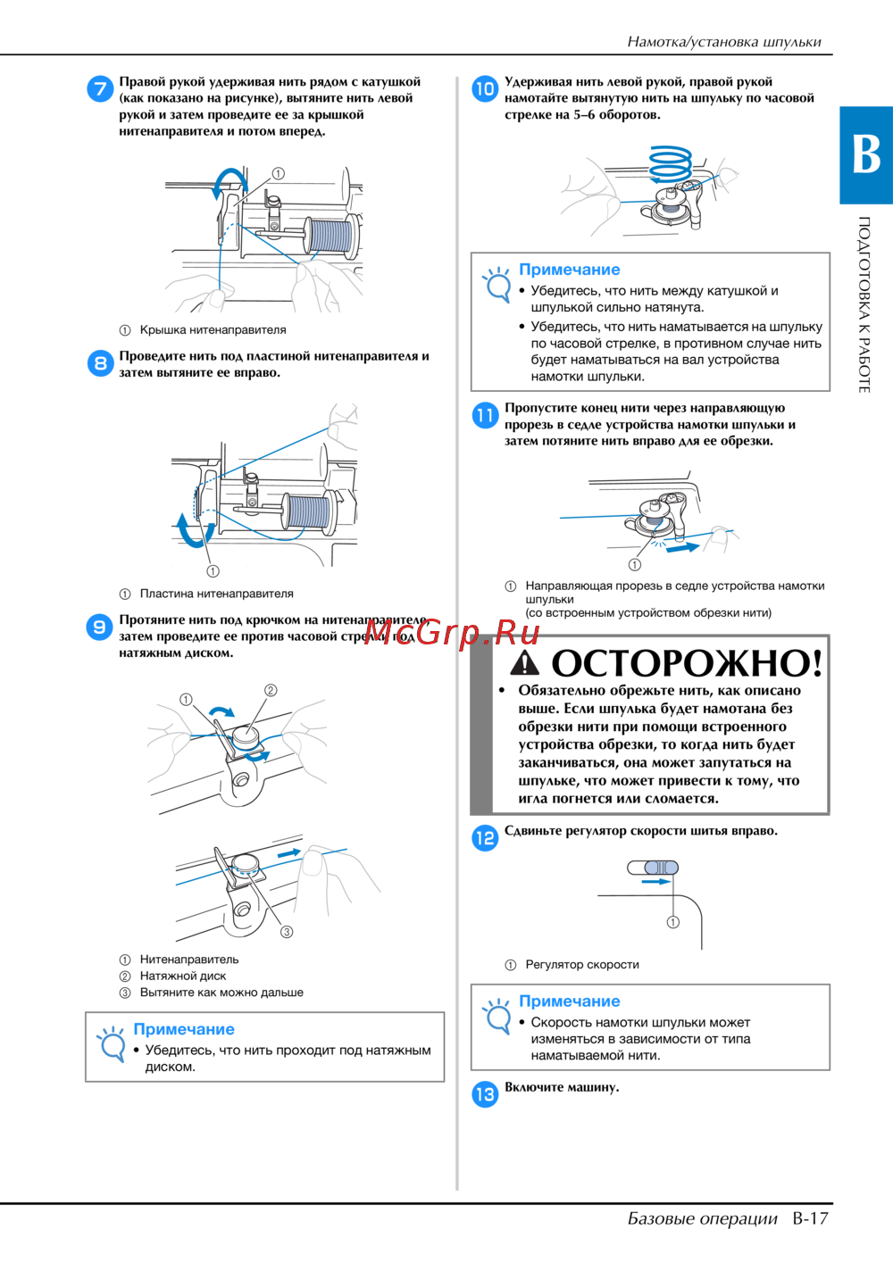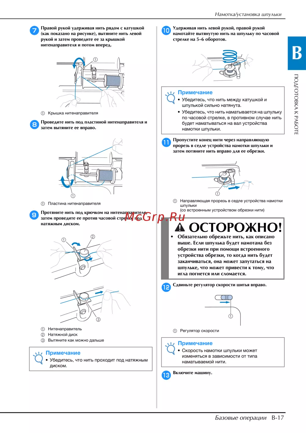 - Не снимайте седло устройства намотки шпульки даже если нить запуталась под ним это может привести к травме не выворачивайте винт направляющего стержня устройства намотки шпульки так как в противном случае возможно повреждение машины невозможно размотать нить вывернув винт p.128