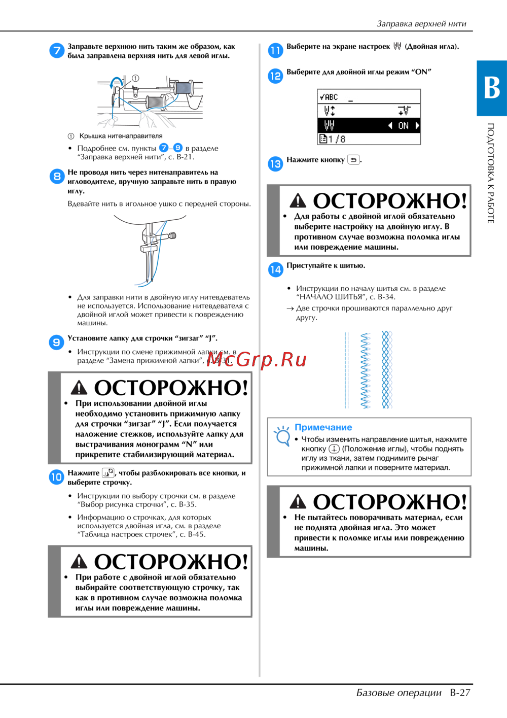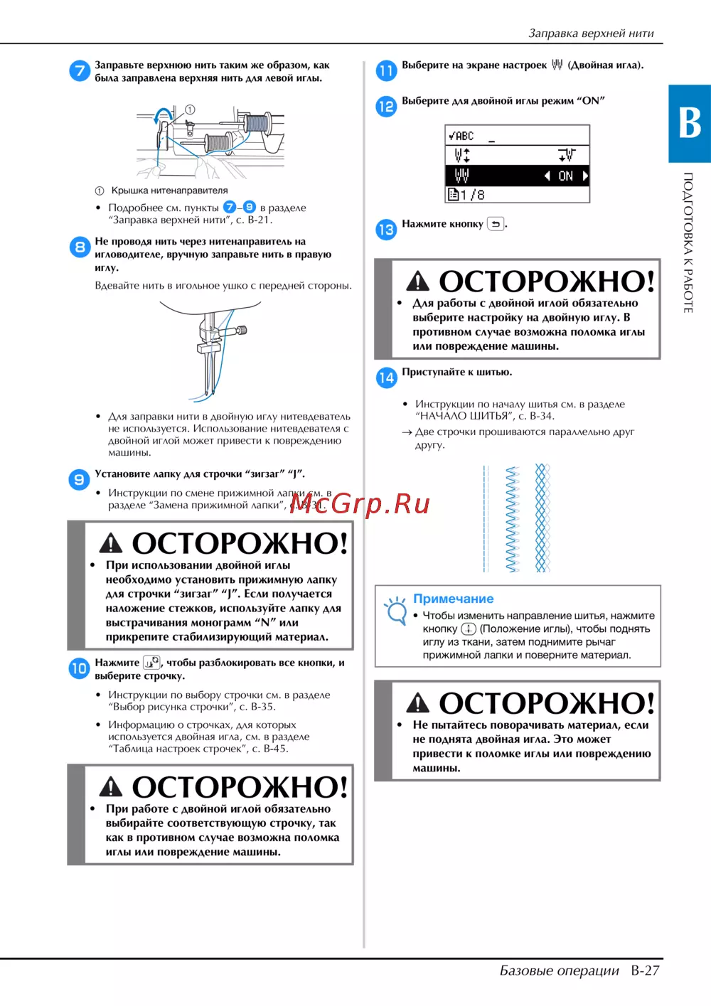 Узнайте, как правильно заправить верхнюю нить и использовать двойную иглу. Следуйте инструкциям для предотвращения поломок и повреждений швейной машины.