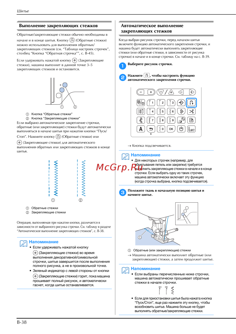 “Автоматическое выполнение закрепляющих стежков”, с. B-38.
