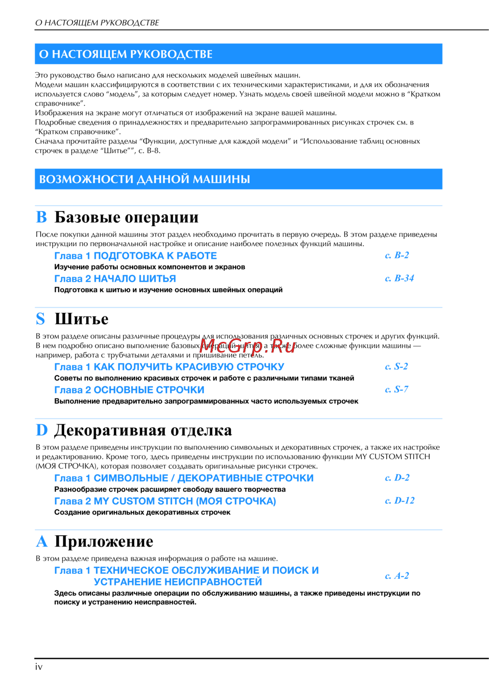 В нем подробно описано выполнение базовых операций шитья, а также более сложные функции машины —