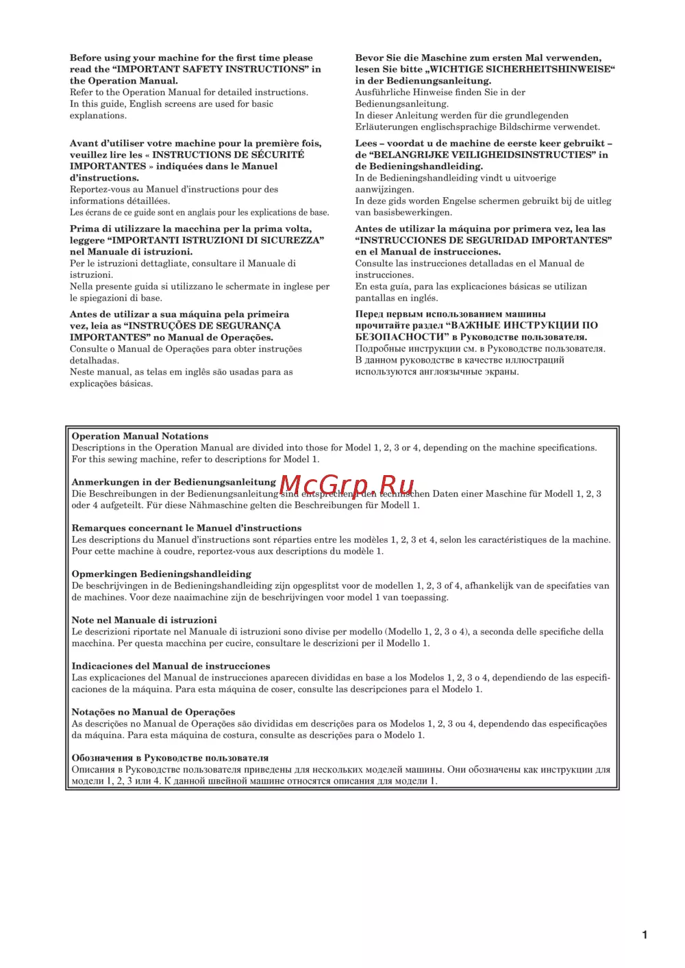 Перед первым использованием машины обязательно ознакомьтесь с важными инструкциями по безопасности и подробными указаниями в Руководстве пользователя для безопасной эксплуатации.