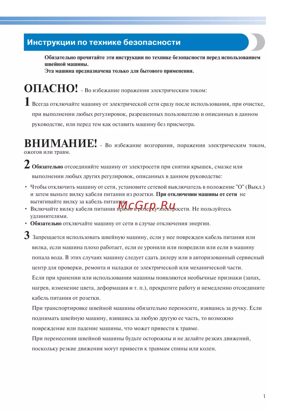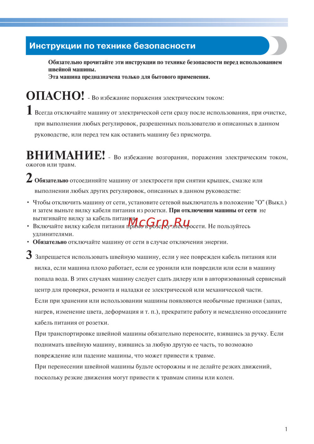 3 Запрещается использовать швейную машину, если у нее поврежден кабель питания или