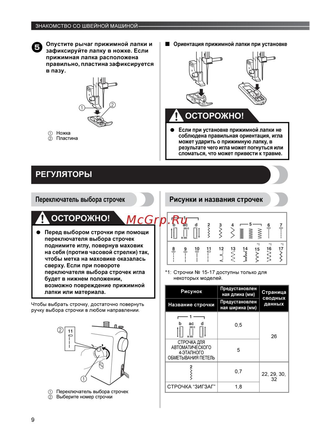 - Не включайте машину во время нажатия на педаль машина может неожиданно начать работать что может привести к телесным повреждениям или порче машины p.32