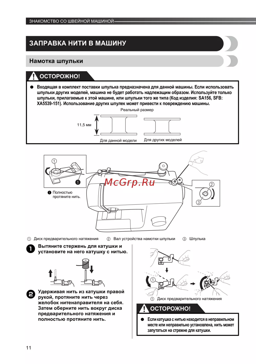 XA5539-151). Использование других шпулек может привести к повреждению машины.