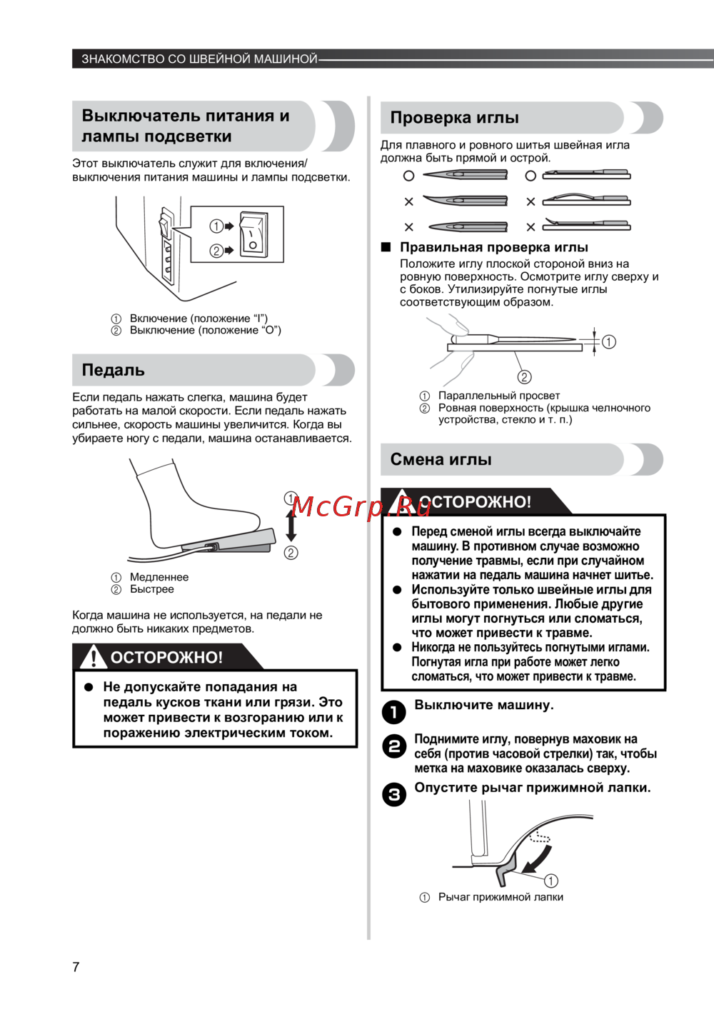 - Отключайте машину от электрической сети перед выполнением действий по регулировке описанных в данном руководстве пользователя p.2