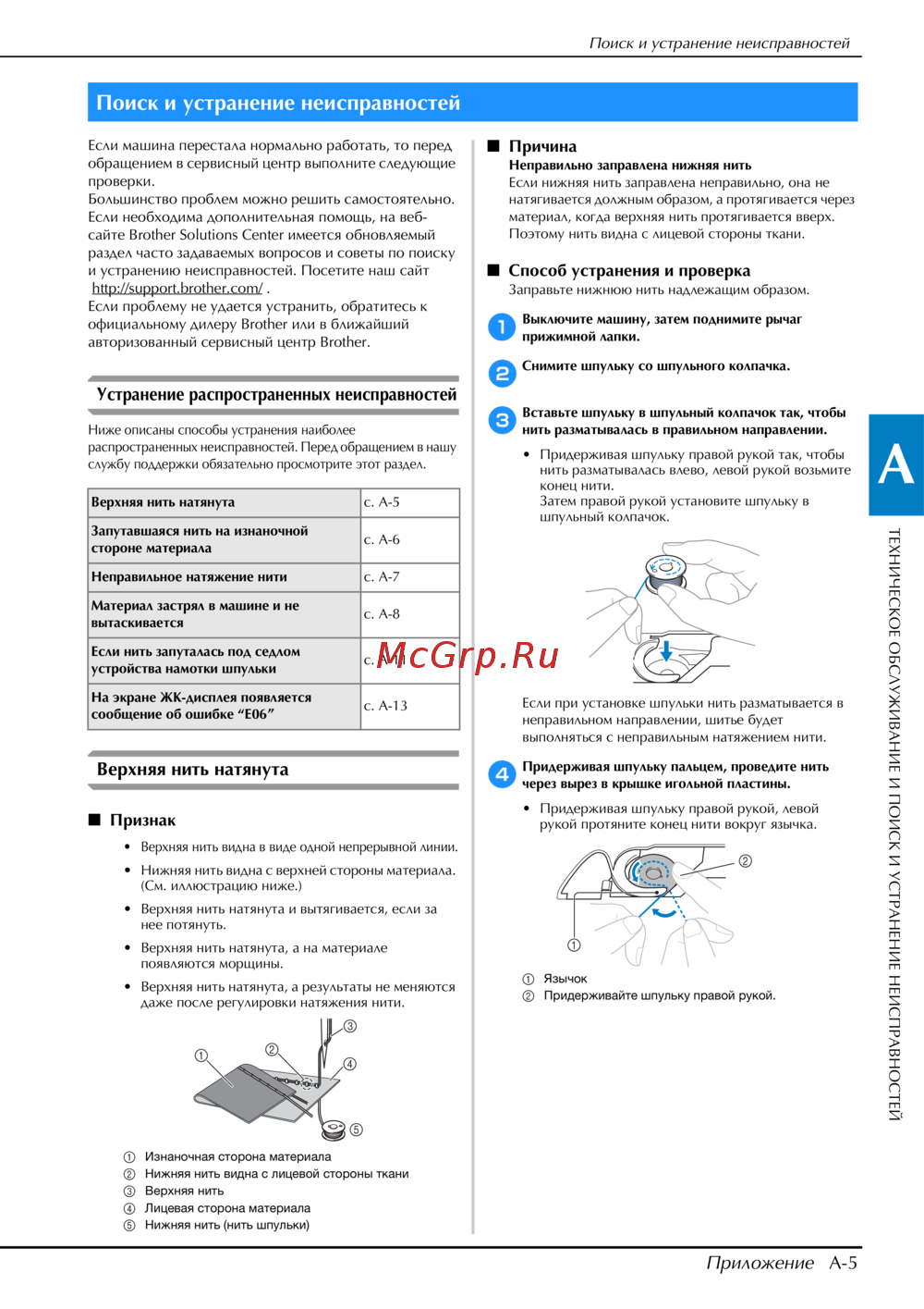- Убедитесь в правильной установке шпульного колпачка в противном случае возможна поломка иглы p.106