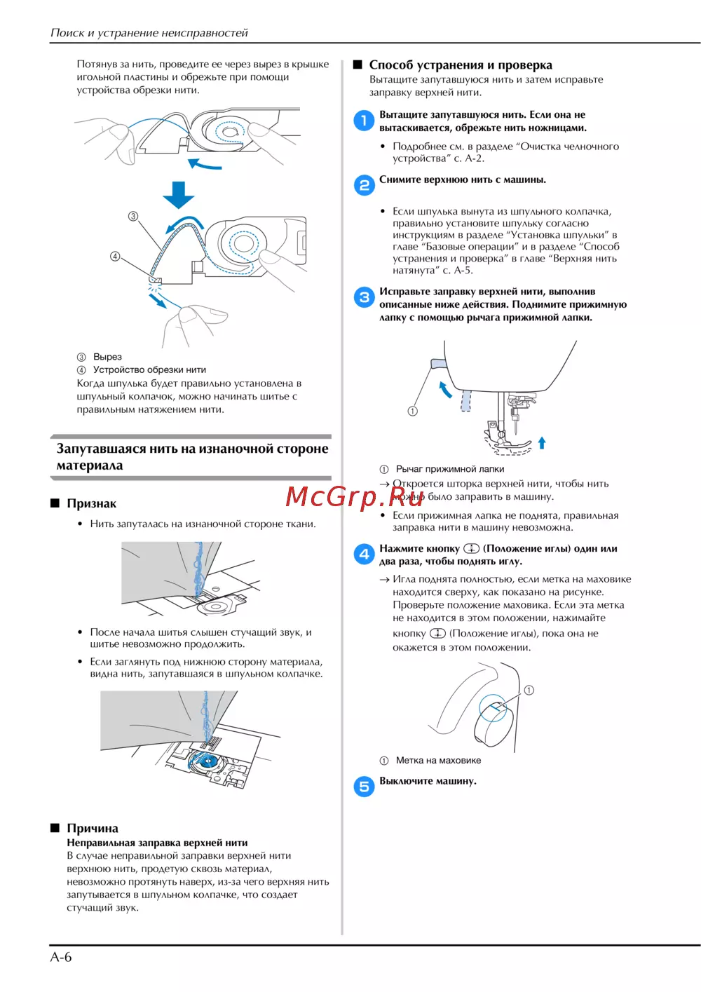 - Убедитесь в правильной установке шпульного колпачка в противном случае возможна поломка иглы p.106