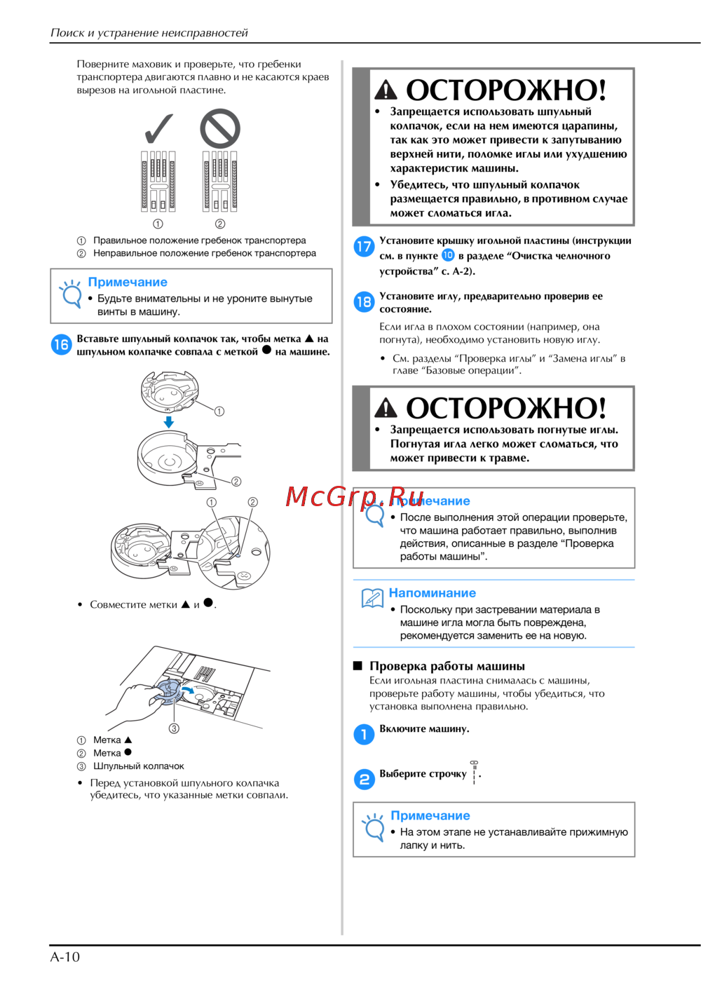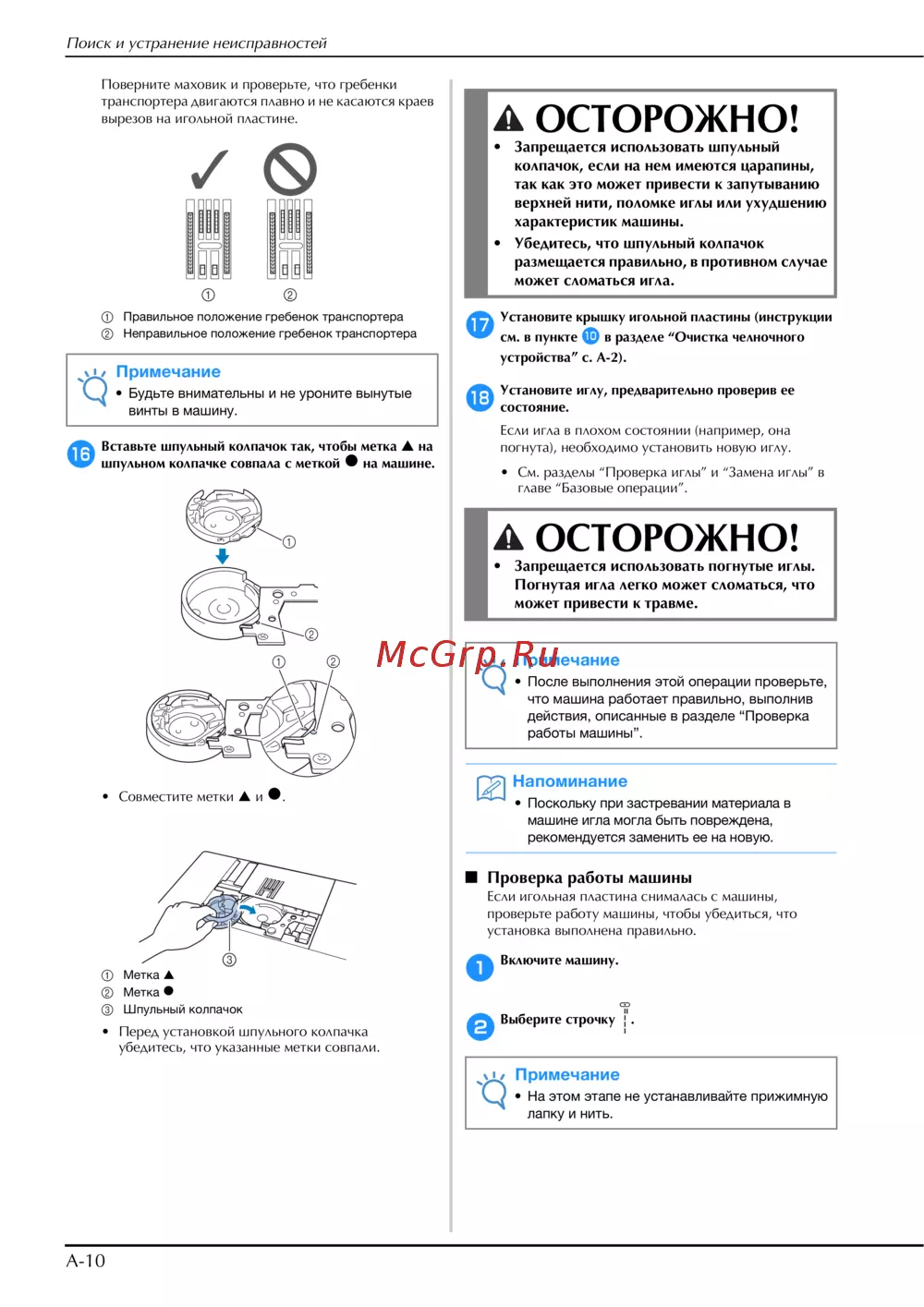 - Убедитесь в правильной установке шпульного колпачка в противном случае возможна поломка иглы p.106