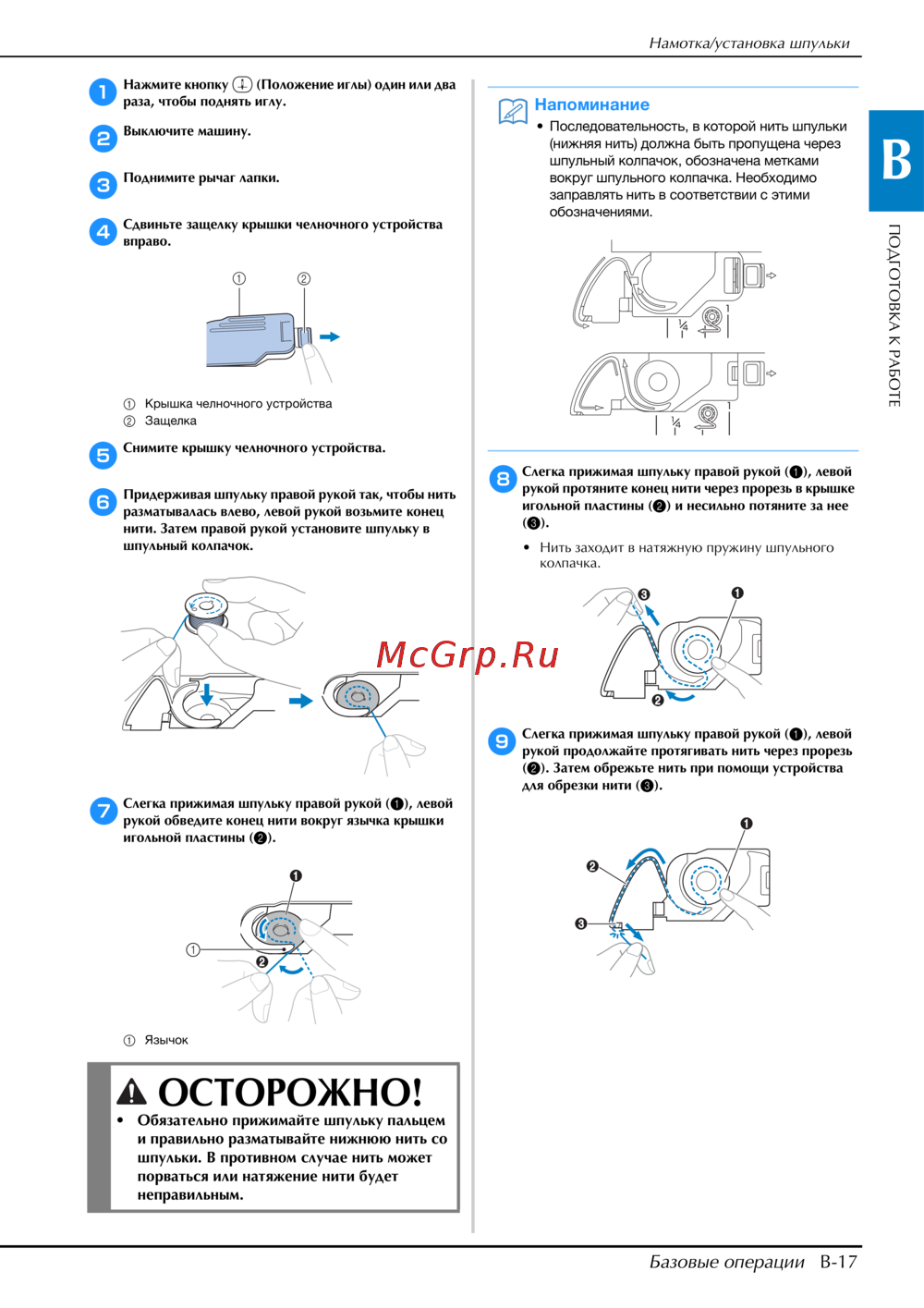 - Убедитесь в правильной установке шпульного колпачка в противном случае возможна поломка иглы p.106