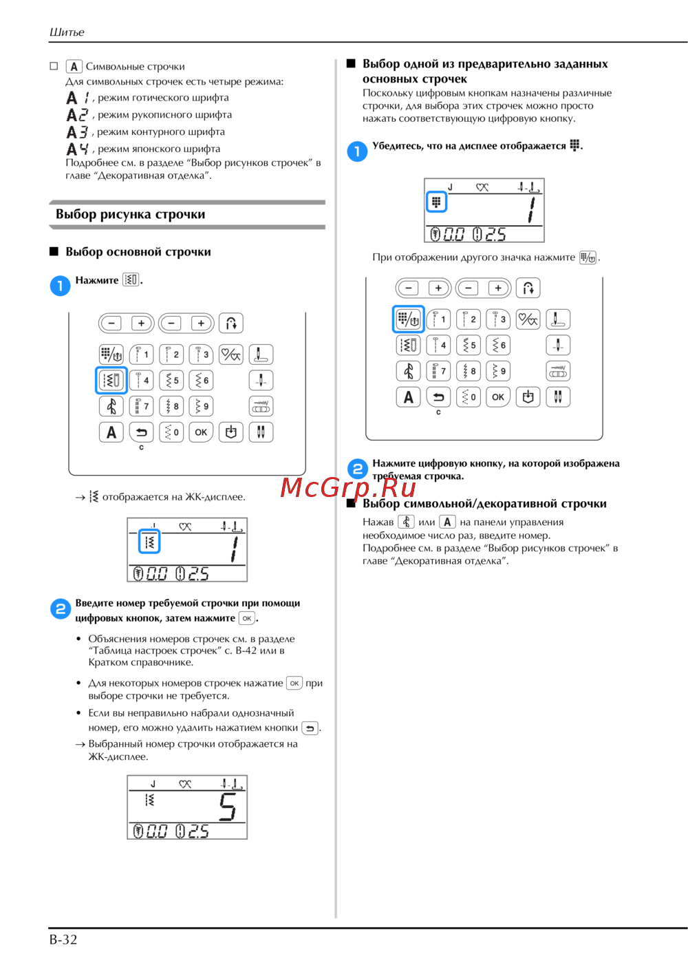 Узнайте, как выбрать символьные и декоративные строчки для шитья. Подробные инструкции по режимам и выбору строчек на ЖК-дисплее.
