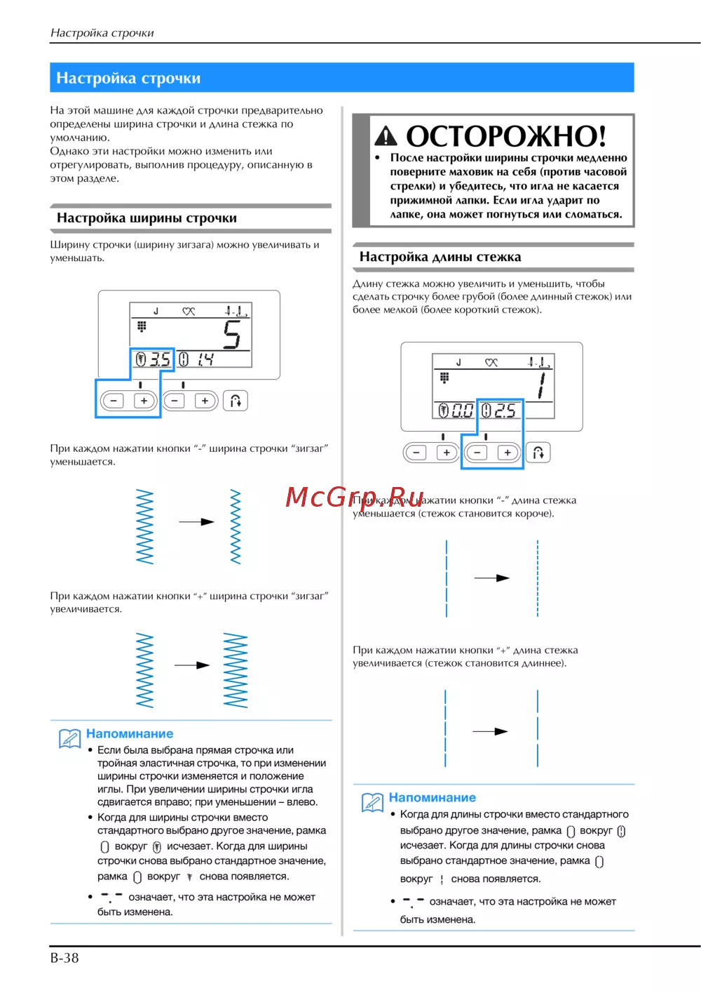 При каждом нажатии кнопки “+” длина стежка