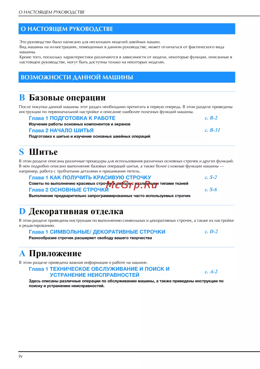 В нем подробно описано выполнение базовых операций шитья, а также более сложные функции машины —
