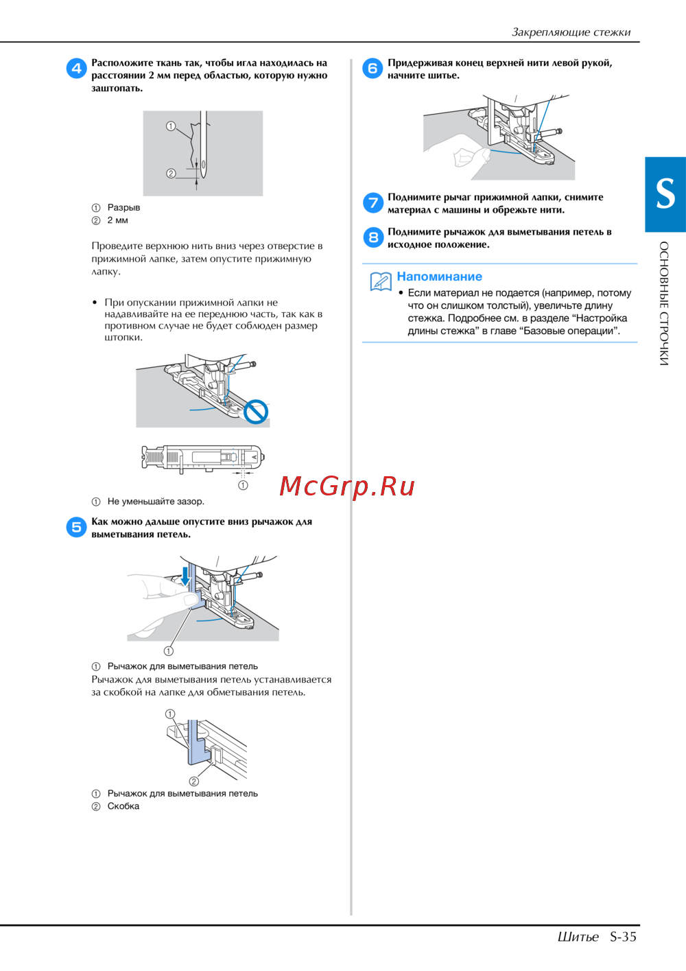- Убедитесь в правильной установке шпульного колпачка в противном случае возможна поломка иглы p.106