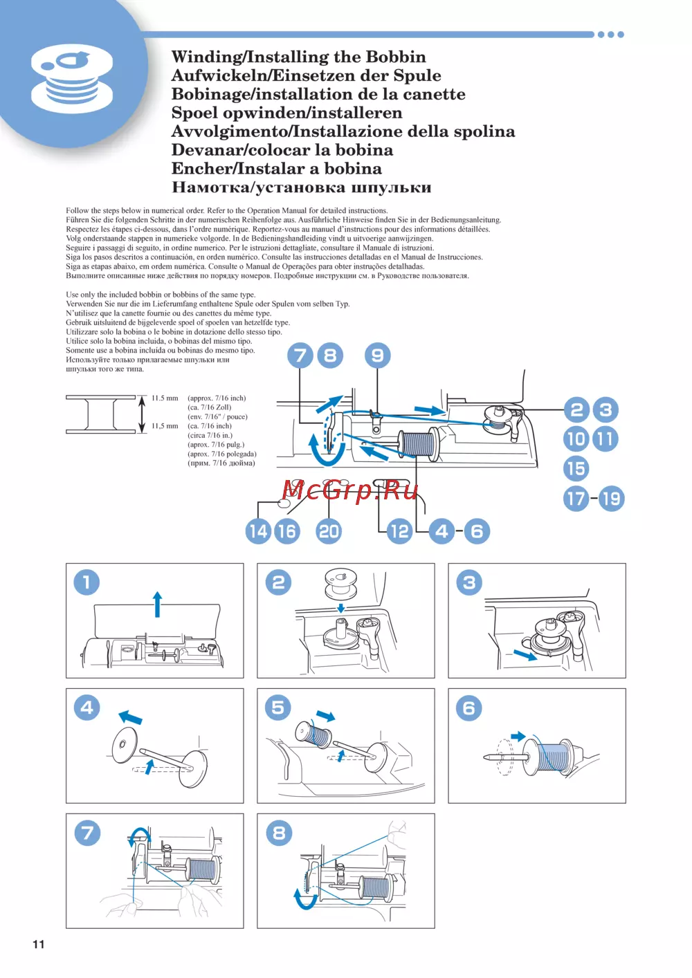 - Winding installing the bobbin aufwickeln einsetzen der spule bobinage installation de la canette spoel opwinden installeren avvolgimento installazione della spolina devanar colocar la bobina encher instalar a bobina p.12