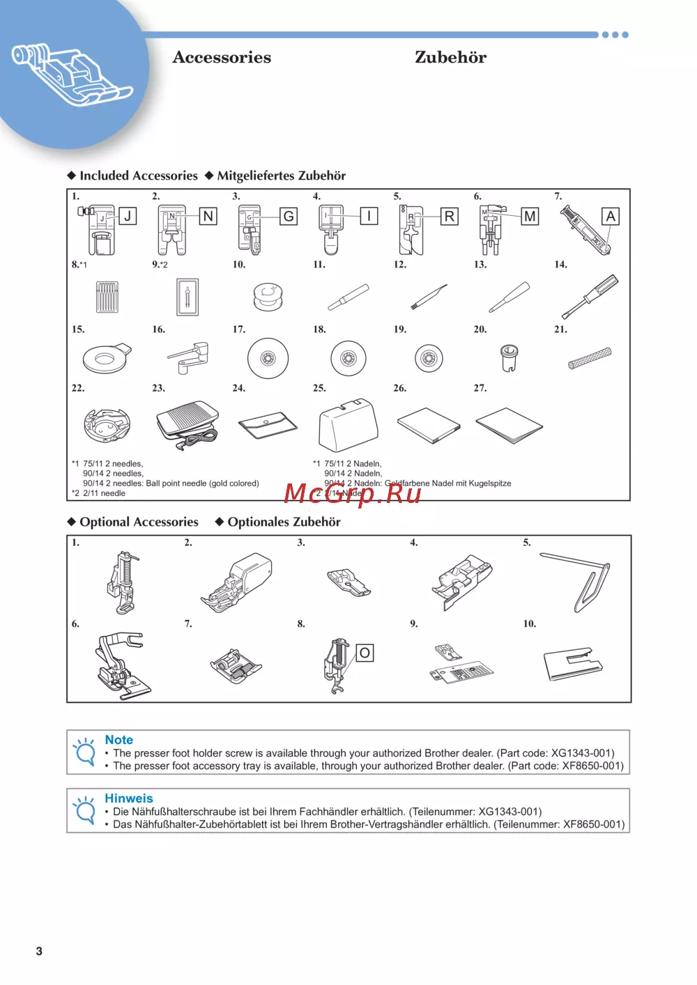 Das Nähfußhalter-Zubehörtablett ist bei Ihrem Brother-Vertragshändler erhältlich. (Teilenummer: XF8650-001)•
