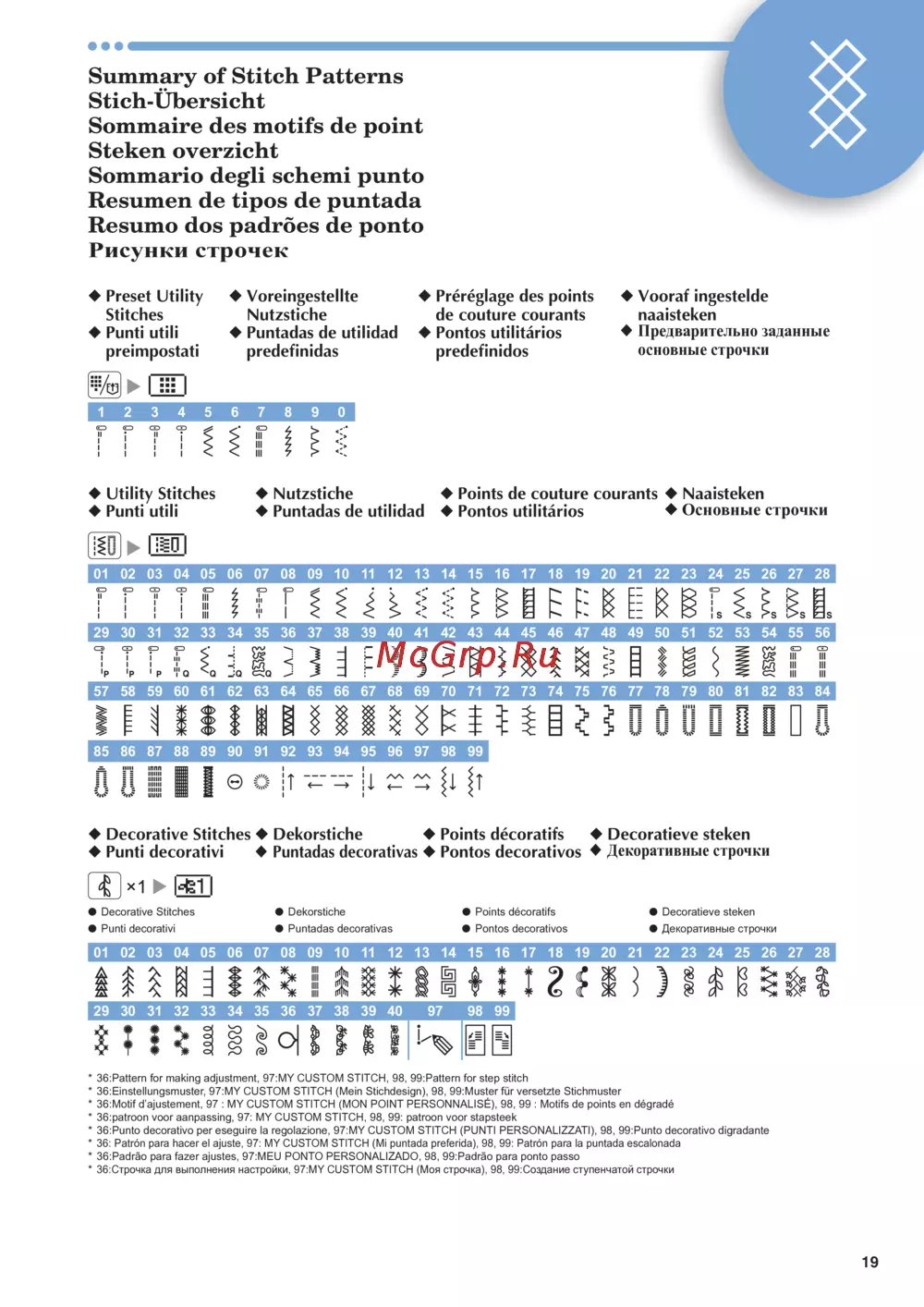 36:Строчкадлявыполнениянастройки,97:MYCUSTOMSTITCH(Моястрочка),98,99:Созданиеступенчатойстрочки*