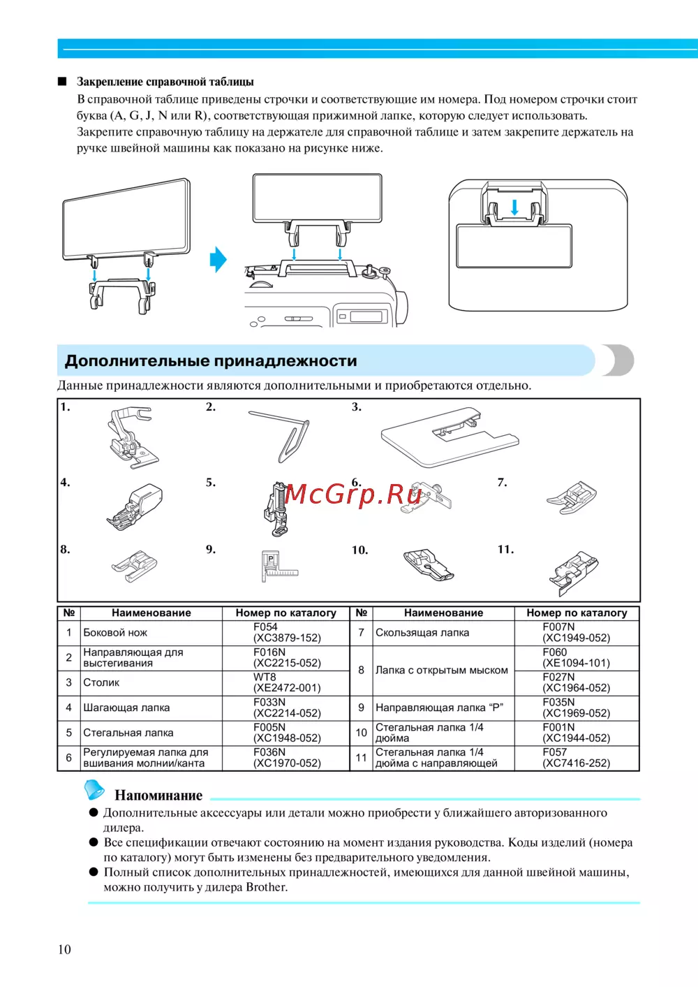 z Полный список дополнительных принадлежностей, имеющихся для данной швейной машины,