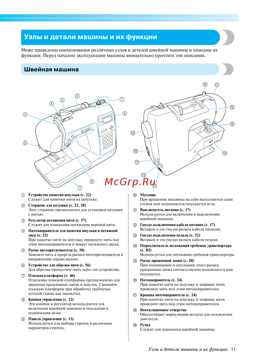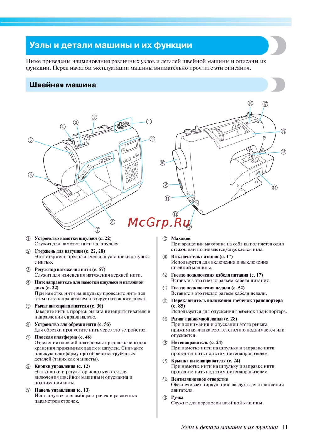 Изучите узлы и детали швейной машины, их функции и назначение. Подробные описания помогут вам правильно использовать устройство и ухаживать за ним.