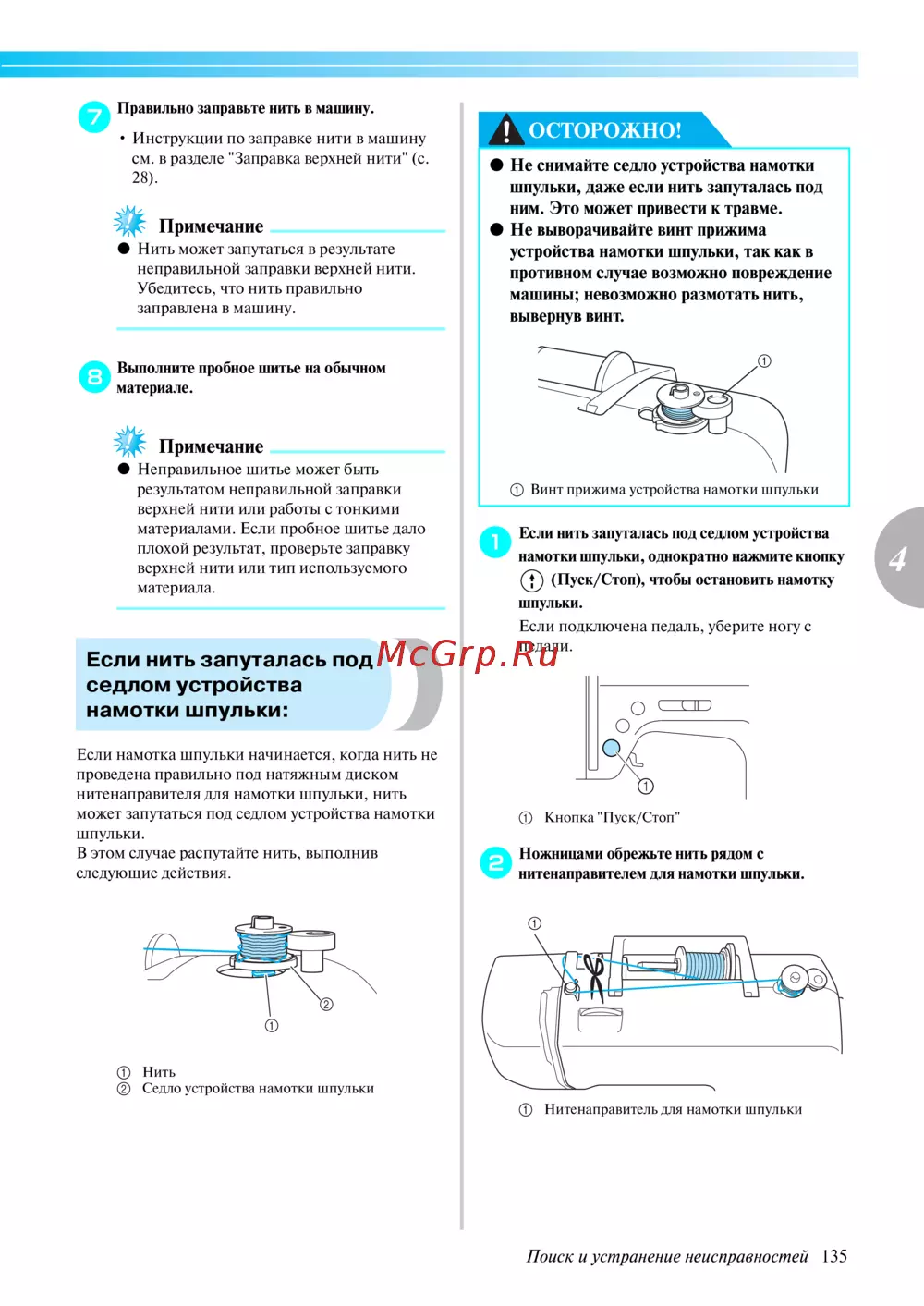 - Если нить запуталась под седлом устройства намотки шпульки p.137