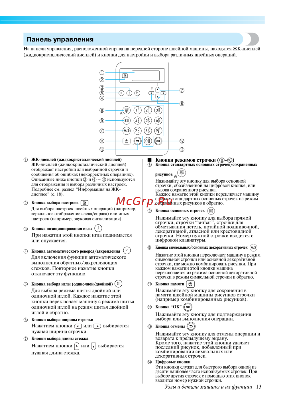 На панели управления, расположенной справа на передней стороне швейной машины, находятся ЖКдисплей