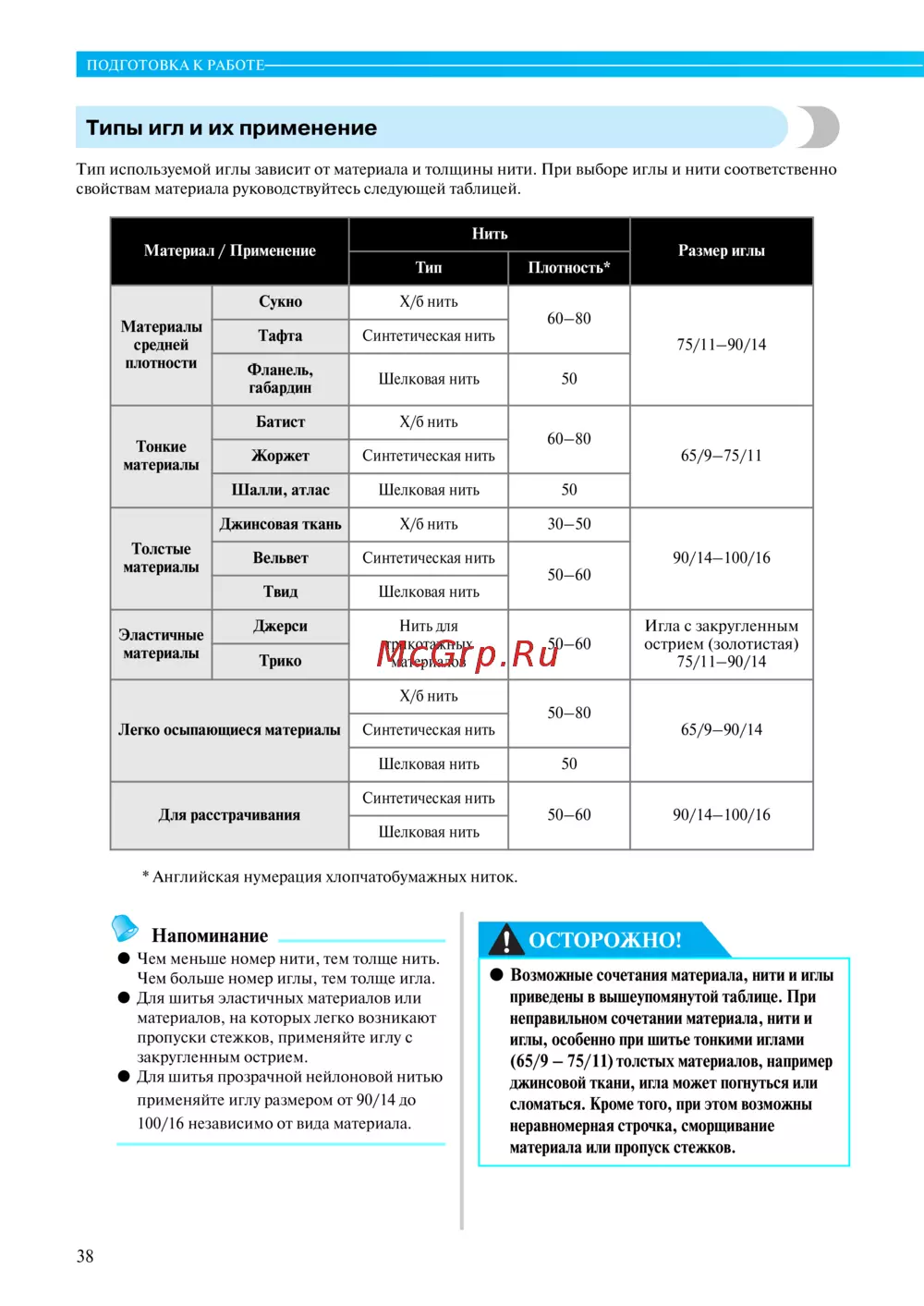 Тип используемой иглы зависит от материала и толщины нити. При выборе иглы и нити соответственно