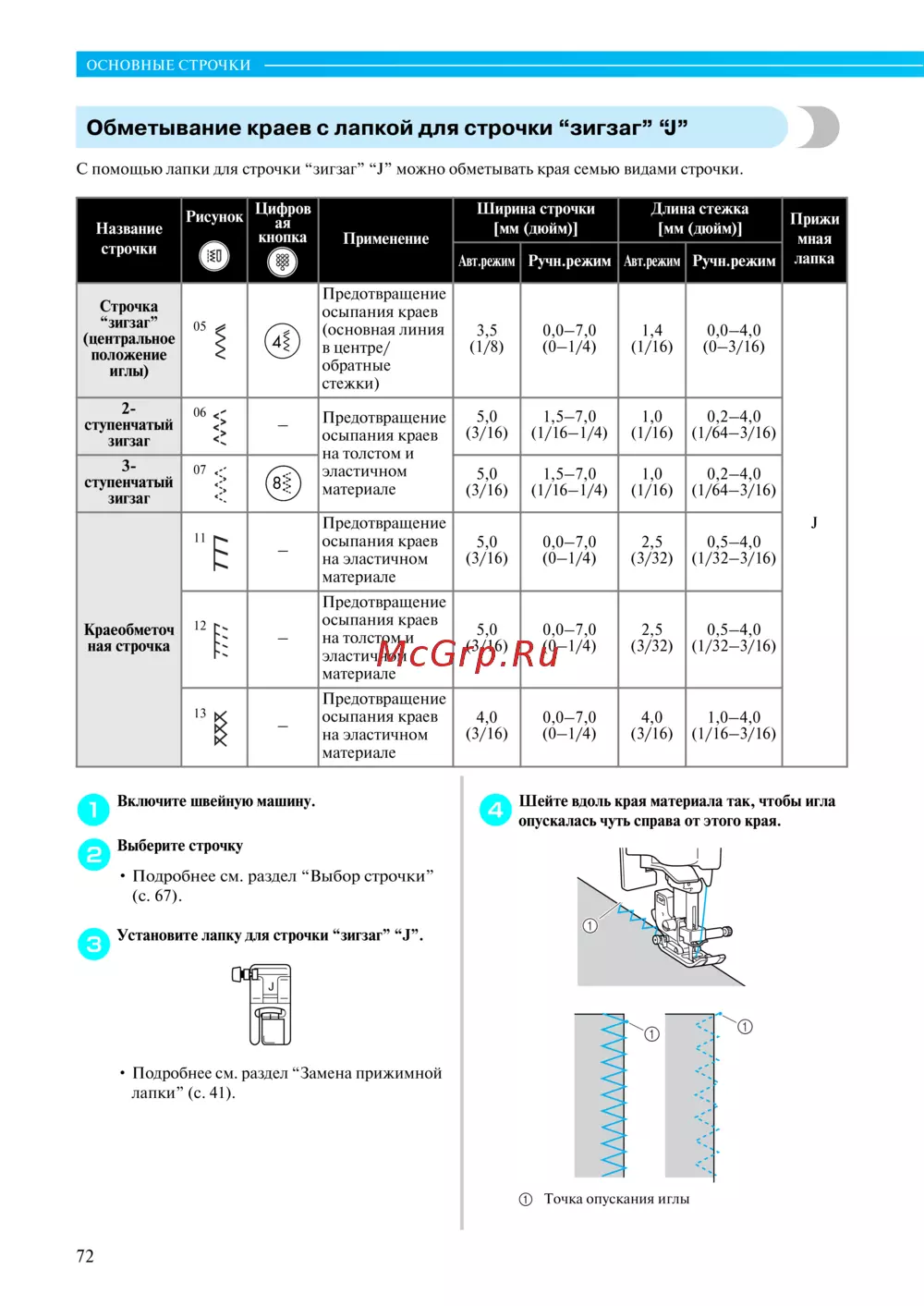 Обметывание краев с лапкой для строчки “зигзаг” “J”
