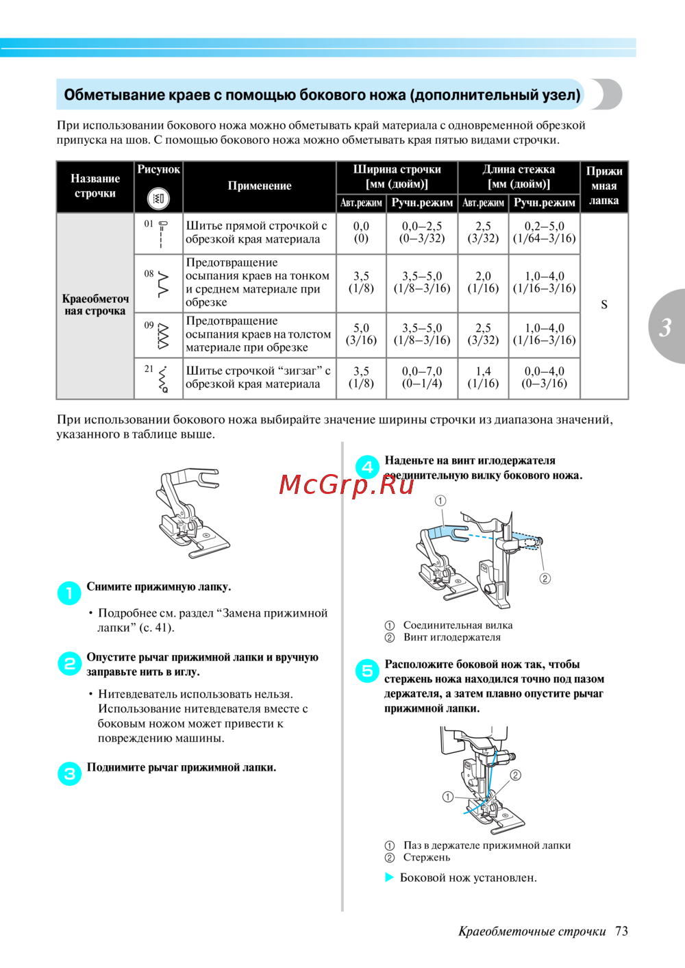 припуска на шов. С помощью бокового ножа можно обметывать края пятью видами строчки.