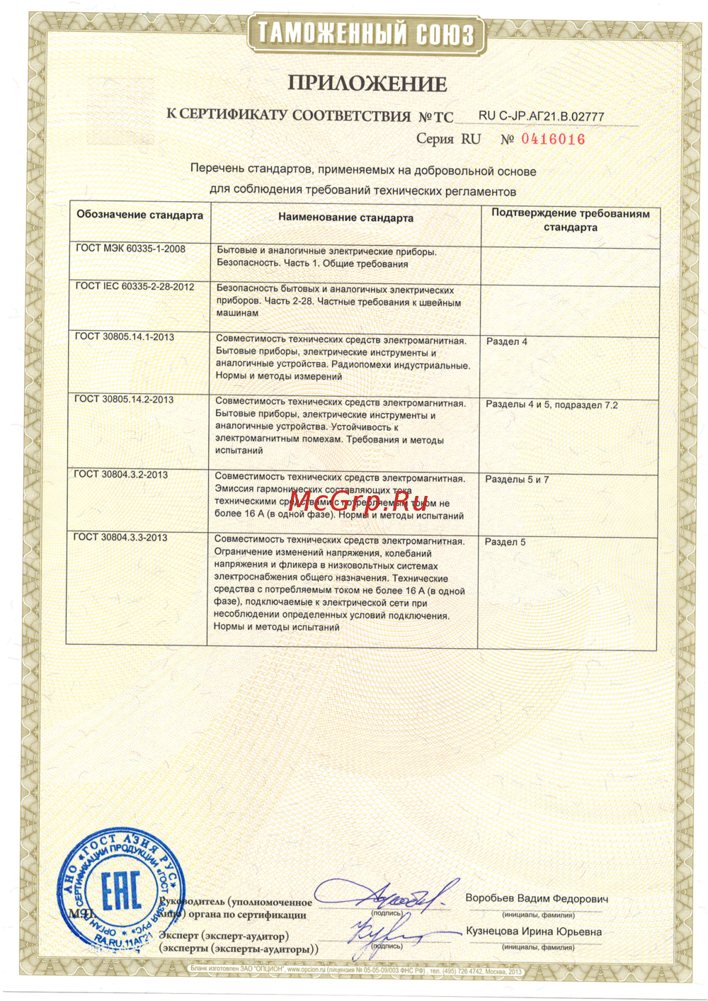 ПРИЛОЖЕНИЕ К СЕРТИФИКАТУ СООТВЕТСТВИЯ ТС С иР АГ21 В 02777 Серия 1Ш 0416016 Перечень стандартов применяемых на добровольной основе для соблюдения требований технических регламентов Обозначение стандарта Подтверждение требованиям стандарта Наименование стандарта ГОСТ МЭК 60335 1 2008 Бытовые и аналогичные электрические приборы Безопасность Часть 1 Общие требования ГОСТ 1ЕС 60335 2 28 2012 Безопасность бытовых и аналогичных электрических приборов Часть 2 28 Частные требования к швейным машинам ГОСТ 30805 14 1 2013 Совместимость технических средств электромагнитная Бытовые приборы электрические инструменты и аналогичные устройства Радиопомехи индустриальные Нормы и методы измерений Раздел 4 ГОСТ 30805 14 2 2013 Совместимость технических средств электромагнитная Бытовые приборы электрические инструменты и аналогичные устройства Устойчивость к электромагнитным помехам Требования и методы испытаний Разделы 4 и 5 подраздел 7 2 ГОСТ 30804 3 2 2013 Совместимость технических средств электромагнитная Эмиссия гармонических составляющих тока техническими средствами с потребляемым током не более 16 А в одной фазе Нормы и методы испытаний Разделы 5 и 7 ГОСТ 30804 3 3 2013 Совместимость технических средств электромагнитная Ограничение изменений напряжения колебаний напряжения и фликера в низковольтных системах электроснабжения общего назначения Технические средства с потребляемым током не более 16 А в одной фазе подключаемые к электрической сети при несоблюдении определенных условий подключения Нормы и методы испытаний Раздел 5 Воробьев Вадим Федорович инициалы фамилия Кузнецова Ирина Юрьевна инициалы фамилия
