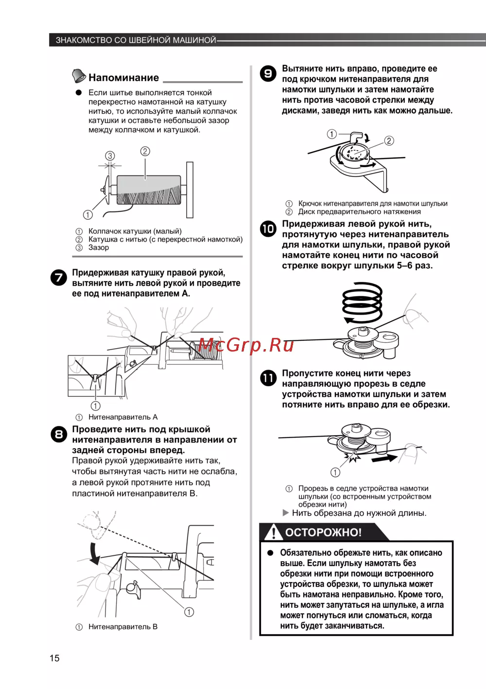 - Убедитесь что шпульный колпачок вставлен правильно так как в противном случае игла может сломаться p.45