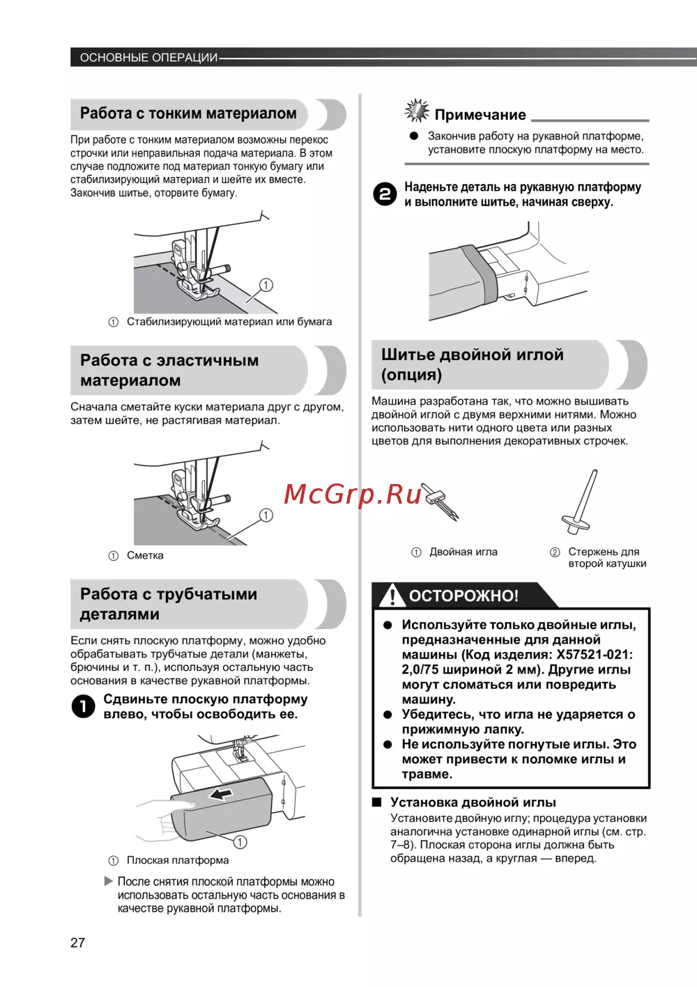 Изучите основные операции шитья, включая работу с тонкими и эластичными материалами, а также трубчатыми деталями. Получите советы по использованию двойной иглы.