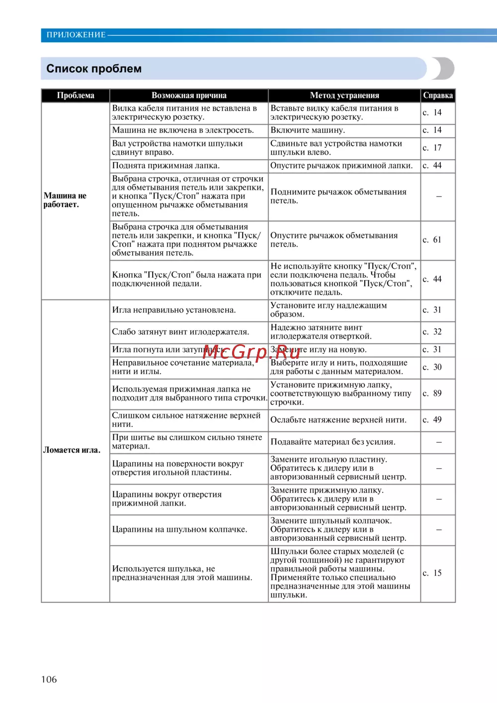 Игла погнута или затупилась. Замените иглу на новую. с. 31