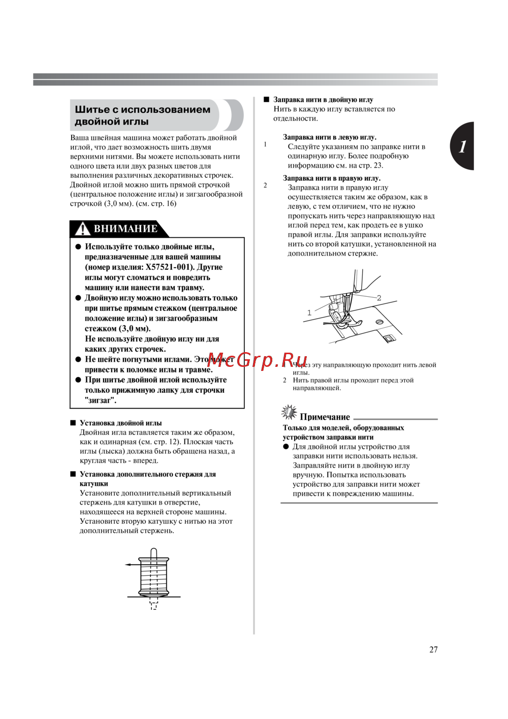 - Для того чтобы надежно затянуть винт крепления воспользуйтесь отверткой при слабой затяжке винта игла может ударить по лапке и причинить травму p.52