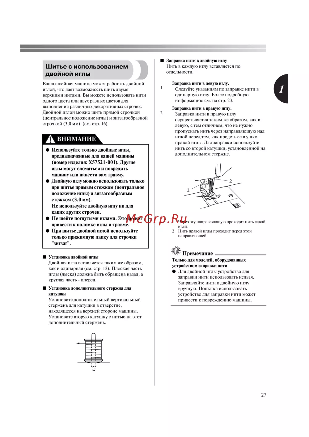 Brother RS 11 — шитье с двойной иглой: установка и заправка нити [28/63]
